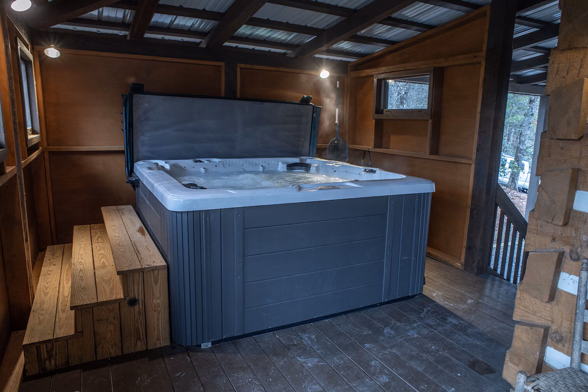 The cabin is a peaceful and quiet place to stay. We didn’t use the hot tub but it looked very inviting. Sitting on the wrap around porch was extremely relaxing. I recommend this cabin to anyone and will come back for another stay.