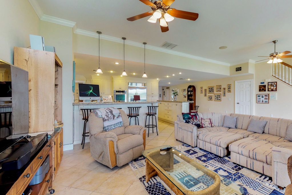Offering four bedrooms, four full baths and one half-bath, this lovely home sleeps 10 guests and up to two well-behaved and housebroken dogs, though a nightly fee per dog and minimum fee per stay will apply. Sleeping options include two king-size beds, one queen-size bed, and eight twin beds. Nine beds are located on the lower level and two master suites are located on the upper level, each offering a private balcony retreat.