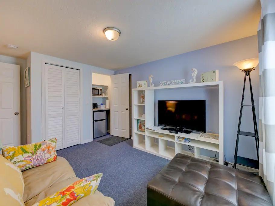 The living room has a fridge and microwave, coffee maker.