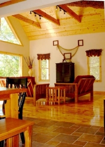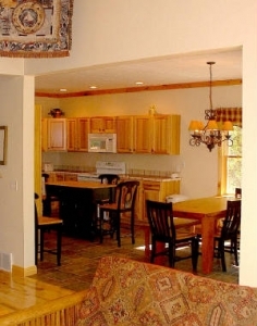 This "Cottage Style" vacation home features, Maple flooring, milled beam accents, ceramic tile, cottage decor, and a cozy fireplace. It is also set up for family fun, with separate areas for adults, and little ones alike.