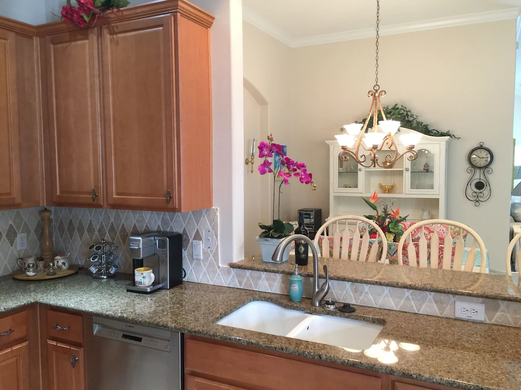 This large 3 bedroom, 2 bath Home with private heated spa and pool. We have a 7-28 night minimum, depending on time of year. This home (1 side of a duplex, with it's own private driveway, garage, backyard, pool and spa) has 2050 Sq ft and a 2 car attached garage, High 11.5 ft and 10 ft ceilings Throughout. The Master bedroom has a King Size bed and both guest bedrooms have full size beds making the home sleep a total of 6 people. It is fully furnished, the kitchen has all new appliances, washer, dryer, and everything you should need. Your vacation home includes a 65" HD TV, 32"Tv in master, 24" TV in 1 bedroom, DVR-Cable, Wireless and wired internet, water, electric, heated pool and spa- ALL INCLUDED! Large Master suite with 2 sinks, private toilet, tub, and huge walk-in shower. All linens, washer, dryer, all kitchen appliances, outdoor grill, microwave, mixer, plates glasses, pots, casserole dishes, pans,....basically everything you need except clothes and toiletries. The pool and spa are heated with an electric heat-pump system that may not work well when temperatures are below 50 degrees (rare). Available for monthly rentals from $3800-$6500 a month based on nightly rate. Rates plus $250 cleaning fee, and 12% tax. Up to 2 pets under 20 lbs or 1 under 40 lbs are allowed with a $100 pet fee. It is 1.2 miles to beach. 3 restaurants in walking distance. Orlando is a little over an hour. You can also order a personal Massage from a certified Therapist for in-home massages for an extra expense if available.