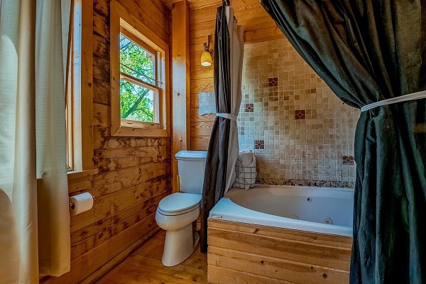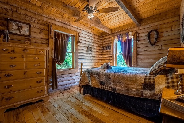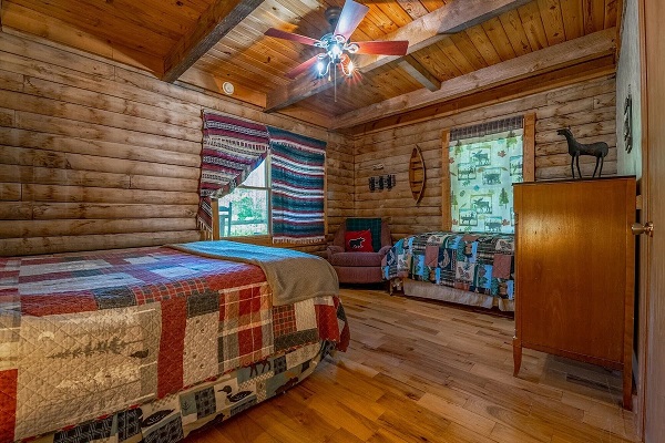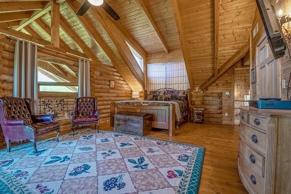 Upstairs there are 2 huge master bedrooms that each have king beds, sitting areas, bathrooms with jacuzzi tubs, and walkout balcony decks with gorgeous views. There is also the bunk room with 2 sets of bunk beds and also a loft area with a very comfy futon and Thomas the Tank Engine track set for the younger train enthusiasts. At the top is the tower bedroom which has incredible views in all directions and has a full bed in it.