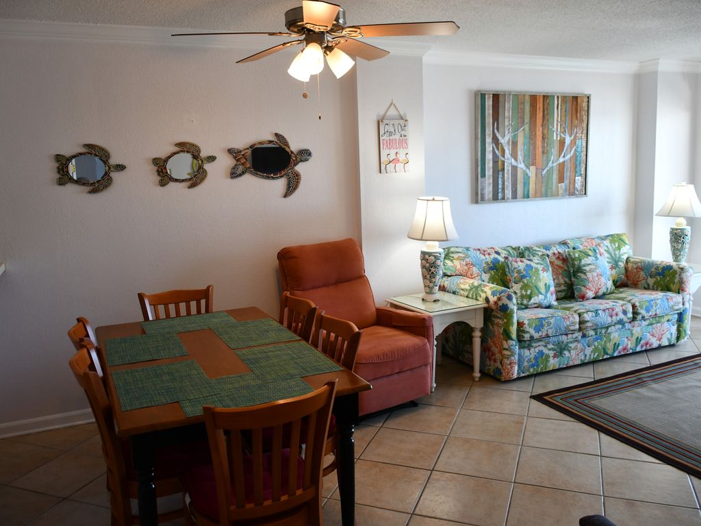 The floor plan of my condo includes a master bedroom with two queen size beds; a second bedroom with one queen size bed, and the living room has a couch that converts into a queen size bed. At the oceanfront end of the living room and master bedroom there are sliding glass doors that open onto the balcony. The floor plan also includes laundry room with a washer and dryer, a fully equipped kitchen and two full baths.