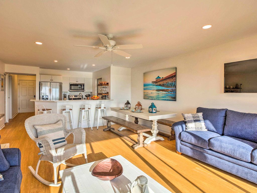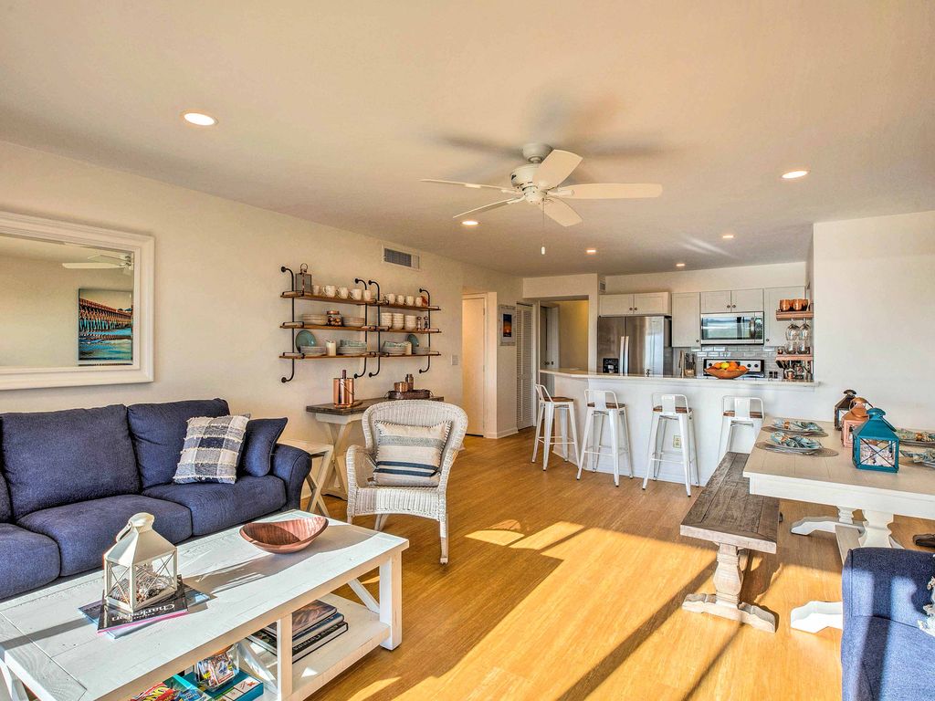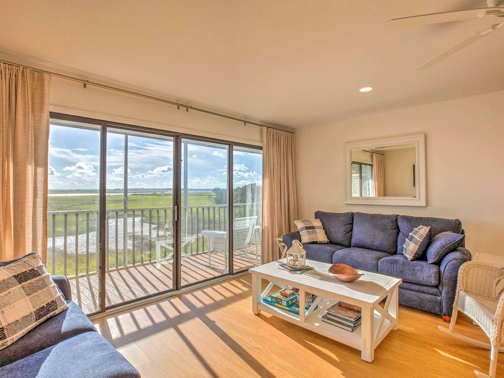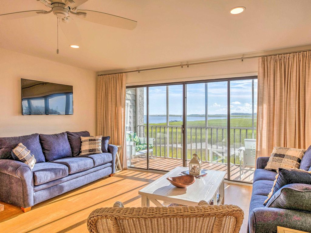 Welcome to your Folly Beach Riverside Inspiration Vacation at 93 Mariners Cay Racquet & Yacht Club where you’ll be inspired with resort-style riverfront living at this vacation rental condo for 8—including majestic river views of sailboats, pelicans fishing, and dolphins playing—with just a 10-minute walk to Folly Beach connecting you to all of the fun Folly Beach restaurants, festivals, and live music to keep you inspired and entertained both day and night. THE PROPERTY Welcome to your Folly Riverside Inspiration Vacation with majestic views of the Folly River—a wildlife sanctuary where “the river runs through it” with boating and fishing and nature’s best wildlife views. Enjoy your own private magnificent sunset views overlooking the river while enjoying a cool drink from your own private screened-in porch. Completely renovated in early 2018—You’ll enjoy luxury top-of-the-line accommodations with the best accoutrements and linens and bedding for the ultimate in entertaining and sleeping accommodations. Fully equipped kitchen with eat at bar for fun get-togethers and dining between tennis and swimming or, if you prefer, the whole gang can sit down to dinner in the lovely farmhouse dining table with designer coastal dinnerware, designed to accommodate 10-12 comfortably for dinner. This Folly Beach Inspiration Retreat is ideal for couples, families with kids, solo adventurers, business travelers, and friendly reunions. This gorgeous “like new” 3 bedroom/2 bath home boasts a beach cottage vibe with upgrades galore including custom bedding unmatched in similarly priced properties. As your host, we supply a delightful and convenient collection of “starter” toiletries and snacks to get your “inspiration vacation” off on the right foot. Now it’s time to put those toes in the sand and get inspired! It offers 1 king (ensuite) and 1 queen bed room plus 3 twin beds and 2 designer Sleeper Sofas--all with top-quality Mattresses so you can actually sleep up to 8 people comfortably. The condo and all furnishings and all mattresses are brand new and selected with top-of-the-line luxury in mind. We didn’t miss a thing—For example, in the family room, the big screen TV