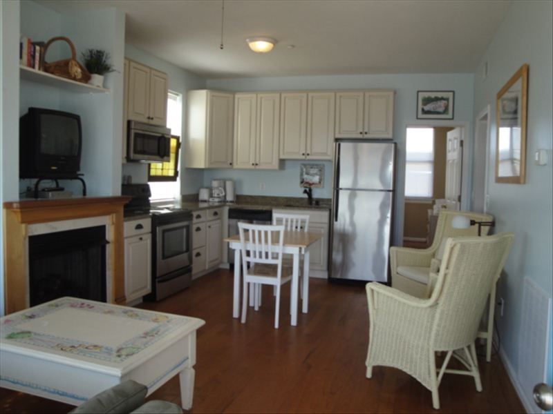 Sunday Aug 27th - Sept 1st is available for one last beach trip for the summer! Kids are back in school so should be nice and not too busy on the beach during the week.*** This oceanfront 1 bedroom 1 bath condo is both charming and cozy. It features hardwood floors, a gas log fireplace, new kitchen cabinets, granite counters, stainless appliances travertine counter in the bath with a vessel sink and new furniture. This condo is an end unit located on the third (top) floor of the building which gives you more privacy and a wonderful ocean breeze for those warm summer nights. You can enjoy both beautiful sunrises and sunsets from the covered porch as you watch the dolphins play.
