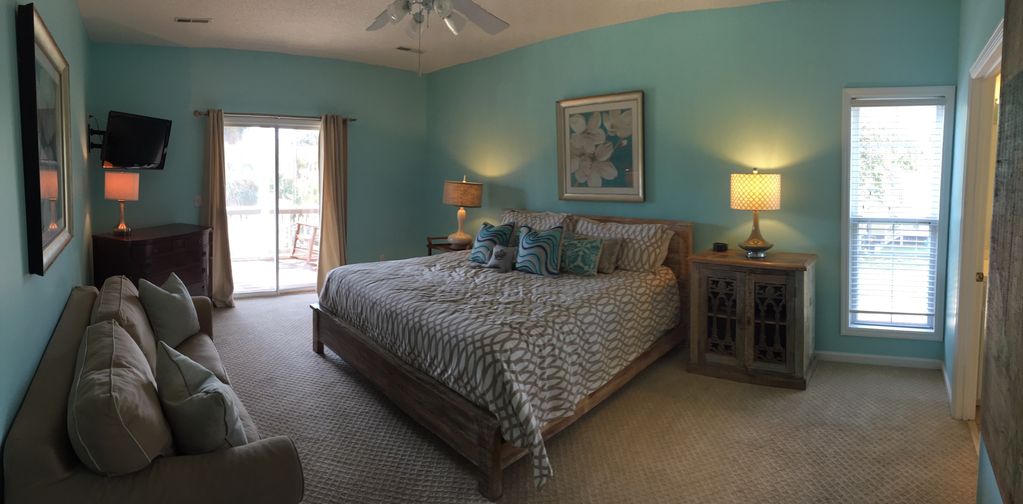 The spacious Master suite is located on the main level and is complete with a king bed, a sitting area, flat screen tv and a private entrance to the screen porch. This is the perfect opportunity to enjoy a private cup of coffee while listening to the ocean waves before everyone else in the house wakes up.