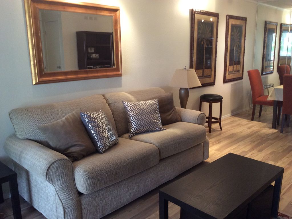 This is a first floor unit, (Ground level ) there are no stairs to worry about. Covered free parking just steps away. The condo, apartment has a 43 TV with standard cable package, a USB port for your Amazon / netflix membership, and has a very good WIFI, also a DVD WIFI player with apps. You will find foot rests under the TV / couch table. There is a remote for the bedroom fan / light on the left side of the bedroom door. We have 10 DVD movies for your use. There is a lot of storage space. Full closet in the bedroom. We have added a small TV that plays only DVDsin the bedrooms, with no cable in the bedrooms.