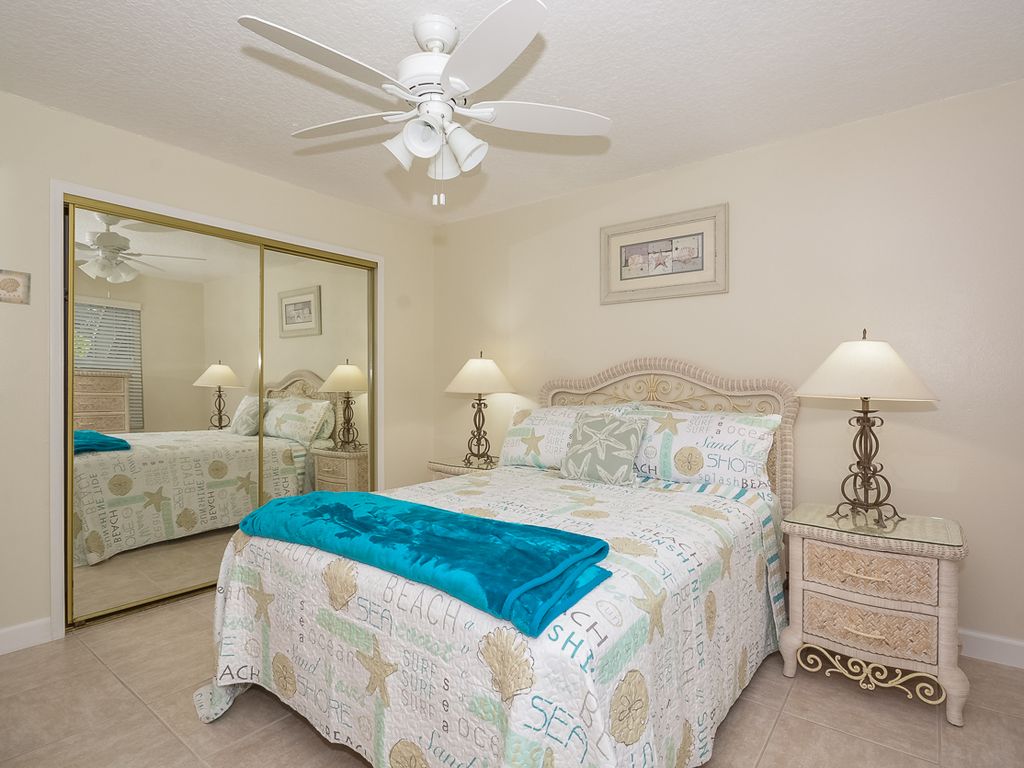 The cozy master bedroom features a queen size bed, flat screen TV, DVD and private bath with walk-in shower. The 2nd bedroom features 2 twins. The 2nd bath features a tub/shower. This condo features a washer/dryer. This unit does not have WiFi, there is WiFi at the pool.