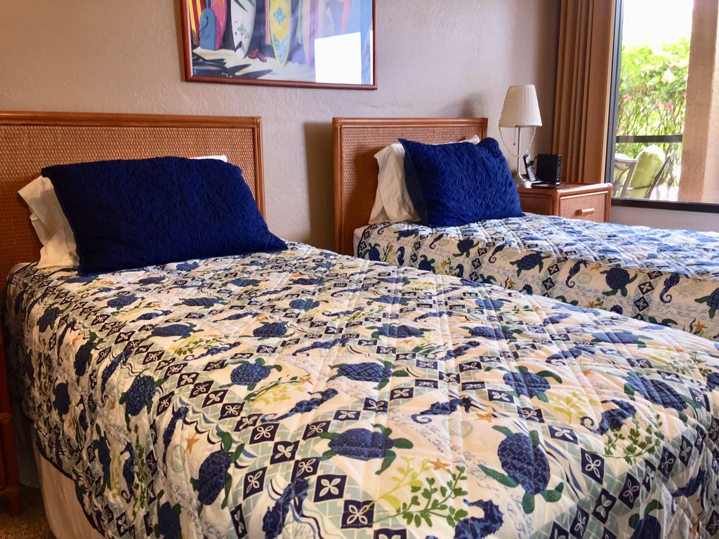 A beautiful ocean view from the lanai for sunset relaxing. Amenities include: a king bed, 2 twin beds (converted to a king by request), and a queen sofa sleeper. Fully appointed kitchen with dishwasher and an ice maker in the fridge. Large washer/dryer in unit. Ceiling fans in bedrooms and living room, with Air Conditioner (honestly you don\'t need it with ceiling fans and sliding glass doors to the lanai in every room).