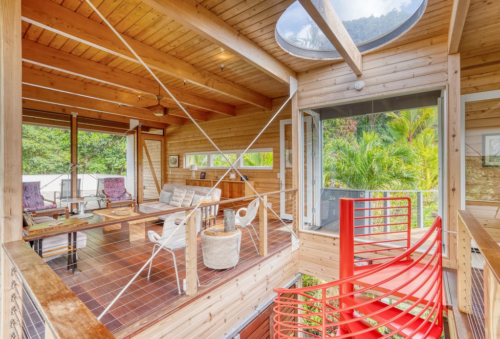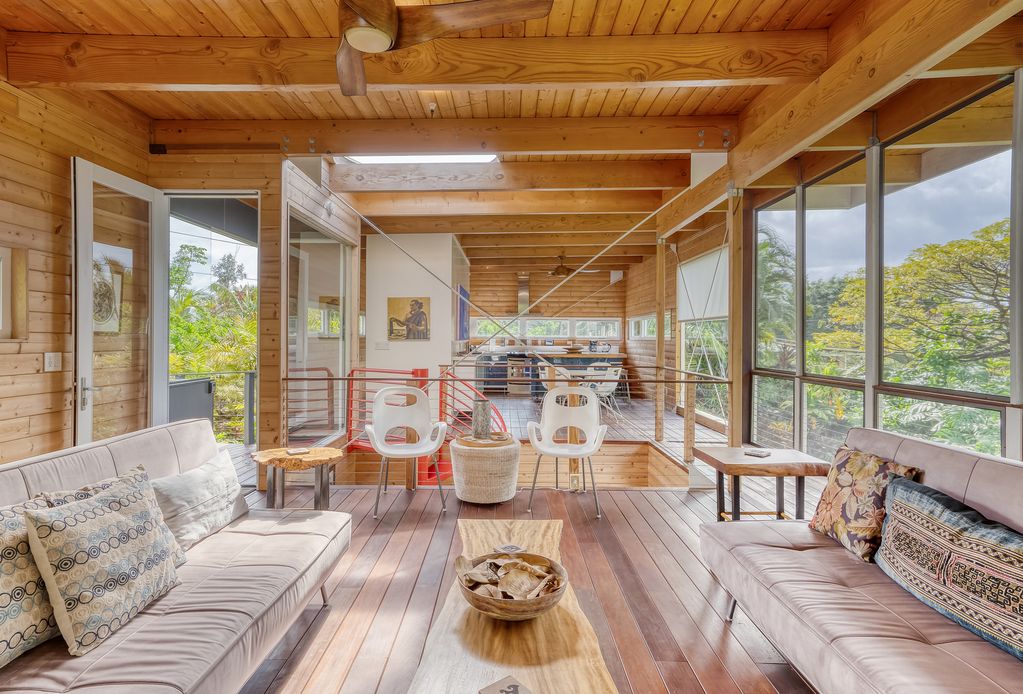 Relax in sleek, contemporary style at this modern PÄhoa getaway, a private screen home once featured in the pages of Dwell Magazine. Walk the black sands of Kehena Beach in the warm island sunshine, and come home to a striking living space with a 500-foot deck where you can dine and unwind among gorgeous monkeypod trees.