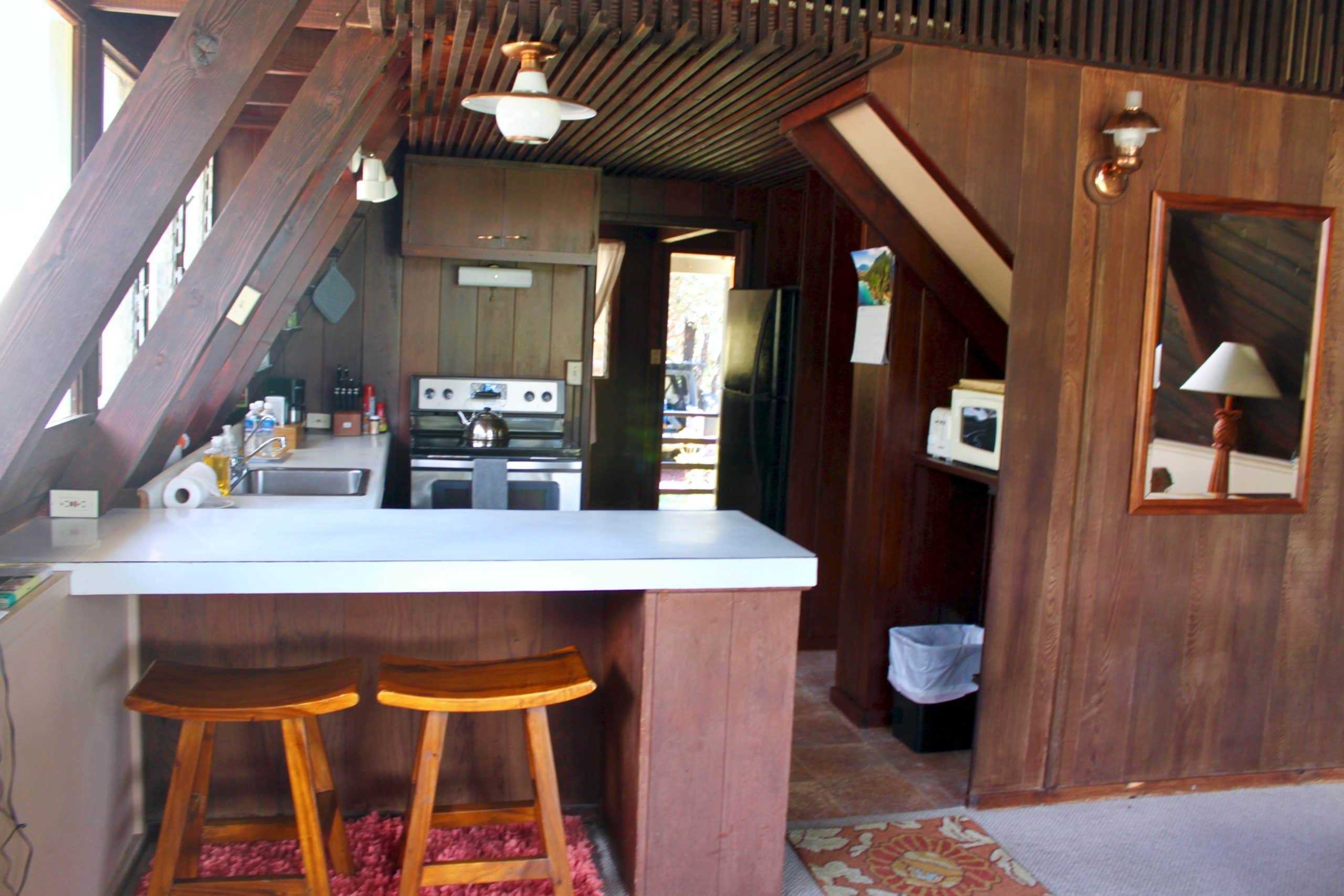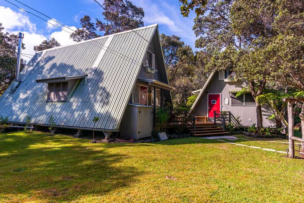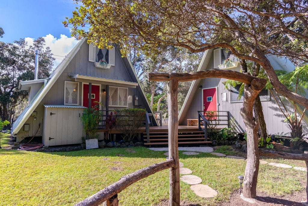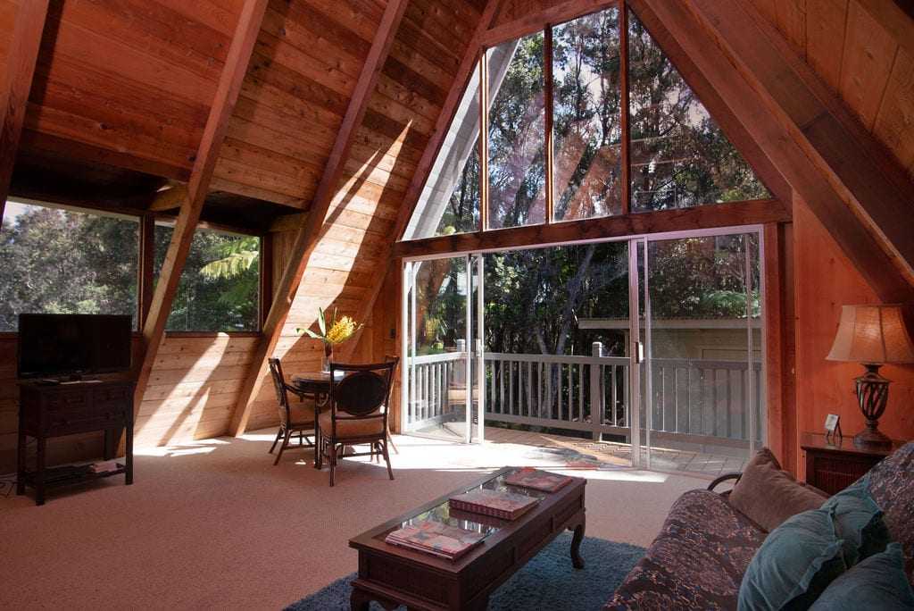 The Volcano cabins are located just outside Hawaii Volcanoes National Park along what used to be the old access road to the Park. These two A-frame cabins are situated on a two acre parcel with ohia trees, redwoods, giant ferns, kahili ginger, and many other interesting plants. There are spectacular views of both Mauna Loa and Mauna Kea from the property. Each cabin is self contained with its own loft bedroom, a bathroom and a kitchen. Both units have their own laundry and private decks. These two cabins named Palila and Nene can be rented separately or together depending on your party size.