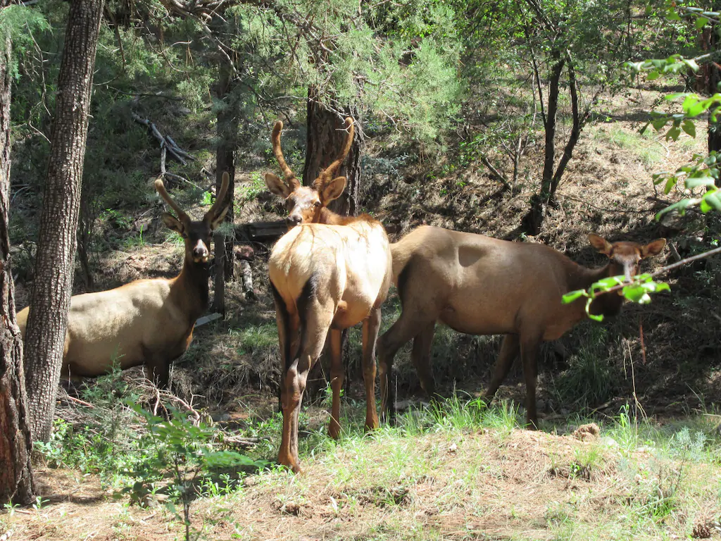 Luxury chalet-style cabin in the pines. Vaulted tongue and groove ceilings, hardwood floors, stainless steel appliances, & granite slab counter tops throughout. Kitchen/great room area and shaded wrap around deck ideal for outdoor vacation gatherings. 3 bedrooms (2 kings, 1 queen) plus loft. Downstairs master suite with granite, large walk in shower and deep soaker tub. Full bath upstairs and power room downstairs, all with granite vanity tops. Satellite HDTV with wireless Blu-Ray player for video streaming and wireless high-speed internet. Wildlife viewing from the relaxing deck including deer, elk and javelin, etc. Less than a mile from the Arizona Trail and restaurants and shops in Pine. Close to Fossil Creek, Water Wheel Falls, East Verde River, Tonto Natural Bridge State Park, Mogollon Rim lakes and endless hiking / mountain biking trails. Only a short and scenic 90 minute drive from the East Valley.