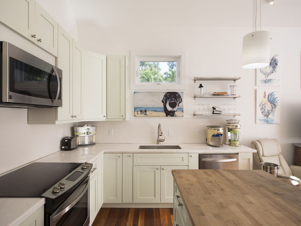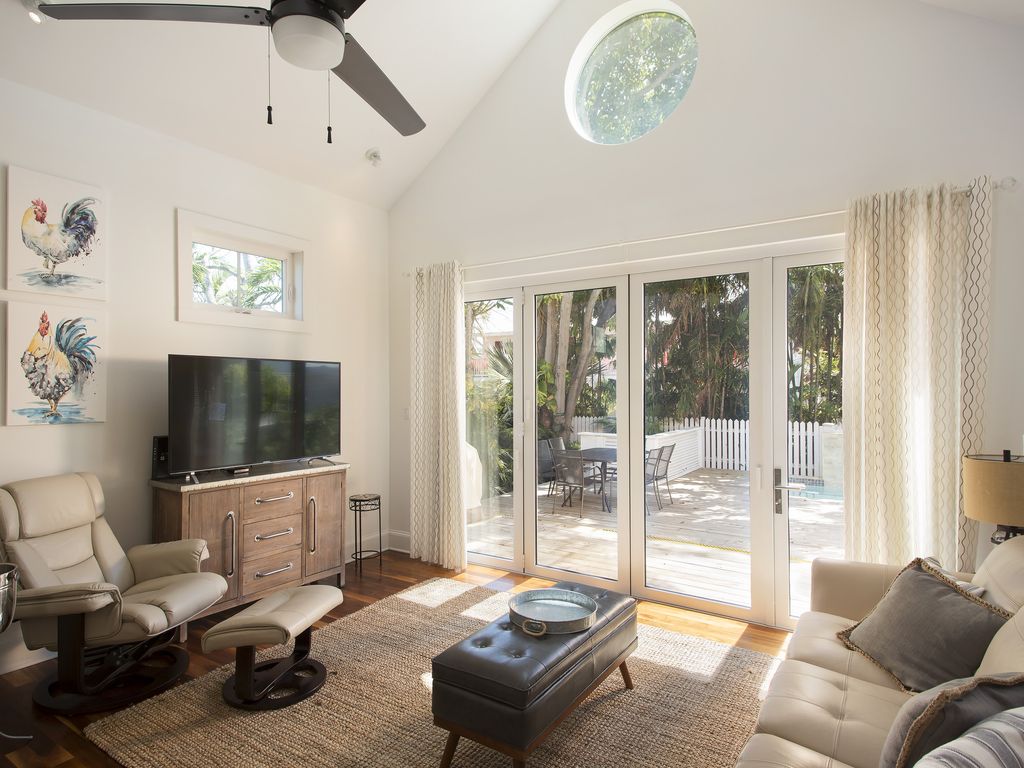 THE INTERIOR: The beautifully renovated interior is the perfect combination of Key West decor and modern refinement. The large, accordion glass doors off the living room allow you to enjoy the refreshing tropical breeze and offer plenty of natural lighting. Sink away into the comfy leather sofa while you watch your huge flat screen HDTV. The updated kitchen features white marble counter tops, quiet-close drawers and cabinets, and a large butcher block island top. Enjoy specialty kitchen appliances like a margarita blender and a shot cooler & pourer, perfect for entertaining!