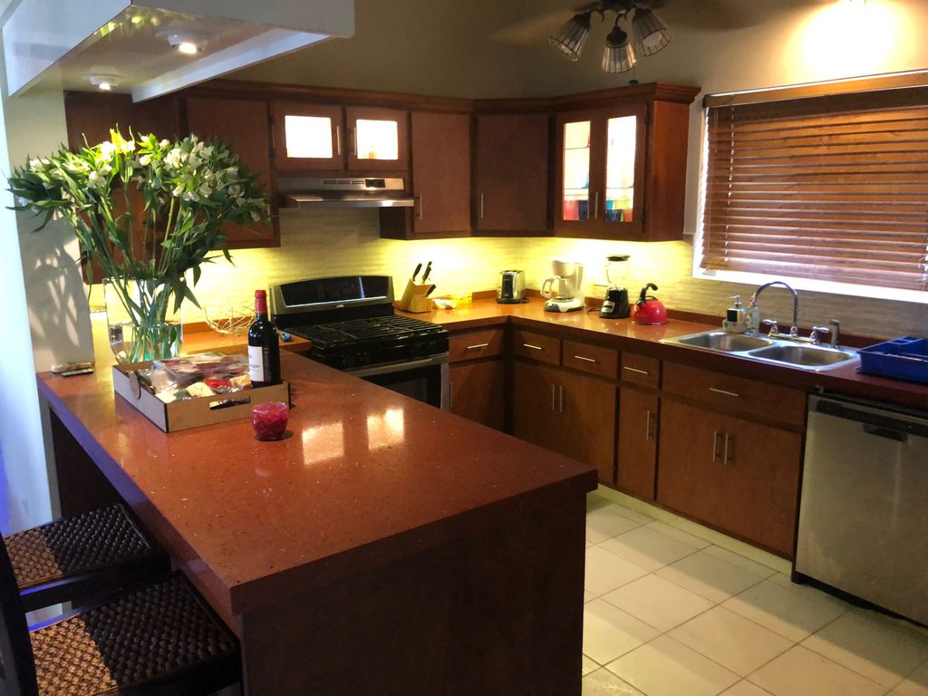 This 5 bedroom, 4 bath villa is very private and secured, fenced off by 12 feet high foliage and remote controlled motorized gated garage which easily accommodates up to 4 full-sized cars. This villa easily sleeps 10-12 persons, including 2 hard-to-choose from master suits fit for a honeymoon.The fully equipped kitchen includes most common seasoning and sauces, over sized coffee maker with starter coffee- and tea packages, microwave, dishwasher and full laundry with dryer. Separate breakfast and elegant formal dining areas. Complimentary villa-wide wifi and cable tv. Complimentary (local) telephone calls with villa wide intercom service. Daily maid service is included for that hotel-like feeling. In-Home Chef cooking is available.