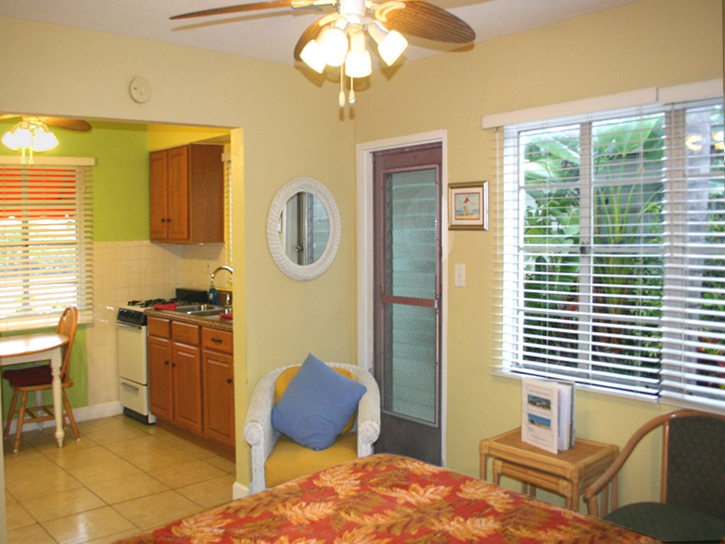 The open-floor plan Mango Tango cottage has full kitchen, queen bed in bedroom, updated bathroom, tiled floor, ceiling fans, flat-screen TV, complimentary WiFi and washer/dryer and of course, A/C, WiFi and parking. Walk out your backdoor to the heated pool!