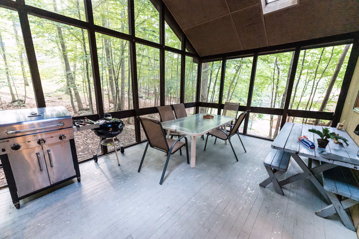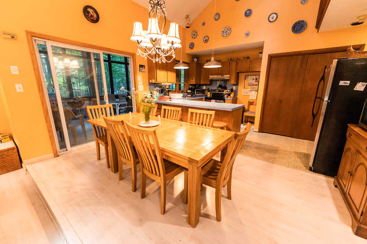 Accommodations: House, 4 Bedrooms + Convertible Bed(s), 2 Baths (Sleeps 8-12) Near the top of the mountain and numerous recreation facilities, a large contemporary awaits you and your vacationing family or group. Soak up the quiet as you watch the deer, wild turkey, raccoons and other wildlife from many tall windows inside. This Non-Smoking, Pet-Friendly home is fresh and inviting. The Great Room, Dining, and Kitchen are entirely open and awesome, with soaring ceilings, a wood-burning fireplace, TV with DVD, a CD/Radio, and lots of comfortable seating, even a rocking chair! In warm weather, there is a large, screened porch with outdoor furniture for your enjoyment. The floor plan encourages togetherness and sharing of special moments.Our Kitchen and adjacent laundry area are fully-equipped, with all the large and small appliances one could need. Just bring your groceries (and detergents and paper products, of course!) and LET THE FUN BEGIN! The first floor has a second Master Bedroom with a Queen bed. There is a second Queen bedroom, and lastly, a full bed in the other bedroom. The first floor bath is Hollywood-style, with two compartments, so that two guests can use it simultaneously. The Master Suite is on the upper, loft area and features a king-size bed, (also a toddler\'s bed), large skylight, a private balcony, and a large bath with two-person Jacuzzi surrounded by natural cedar, mirrors and a wooded view. There is also a separate shower, great after a brisk run in the mountain air. Blankets, pillows, linens, and comforters are provided. There is also a double futon and a sleep sofa in lower level family room.) The Lower Level is one very large Family Room with a pool table, a Foosball game table, TV with DVD, lots of comfortable seating, and room for card playing, games, etc. This is a great room for relaxing after an exhilarating day on the slopes, or hiking around the Poconos. Photos (11) Traveler Reviews (5) Amenities Linens Provided : Pillows, linens, blankets, towels comforters, are provided. Please bring your own beach towels. Wood Fireplace : Usually there is firewood and kindling at the house. Parking Off Street, Washing Machine, Clothes Dryer Wall built-in Air-Conditioning, Entertainment Communal Pool : Pool Table Foosball DVD TV Satellite Or Cable CD Kitchen Cooking Utensils : Crockpot, waffle maker, coffeemaker, blender, a variety of pots, pans. Full Kitchen : New stainless steel electric range and refrigerator. The kitchen overlooks the Great Room and is the centre of all activity! Refrigerator Electric range, Dishwasher, Microwave. Outdoor Features Gas BBQ Grill Charcoal Grill, Deck/Patio Communications: Telephone, Broadband Access, Cable TV with HBO, High Speed Internet, There are even some condiments, laundry supplies, etc, If you need to borrow from the closet, please replace it for the next person Minimum Age Limit For Renters : 25 years or older. Children Welcome. Non Smoking Only. Pets Considered. Activities: Skiing, Snowmobiling, Fishing, Golf Water Skiing, Cross Country Skiing, Rafting, Tennis, Racquetball, Cycling, Swimming, Hiking, Basketball Court, Sight Seeing, Sledding, Boating, Live Theatre Restaurants, Theme Parks, Fitness Center, Snowboarding, , Wildlife Viewing,Shopping, Horseback Riding, Indoor and Outdoor Swimming pools with Hot Tubs, Famous Flea Market.