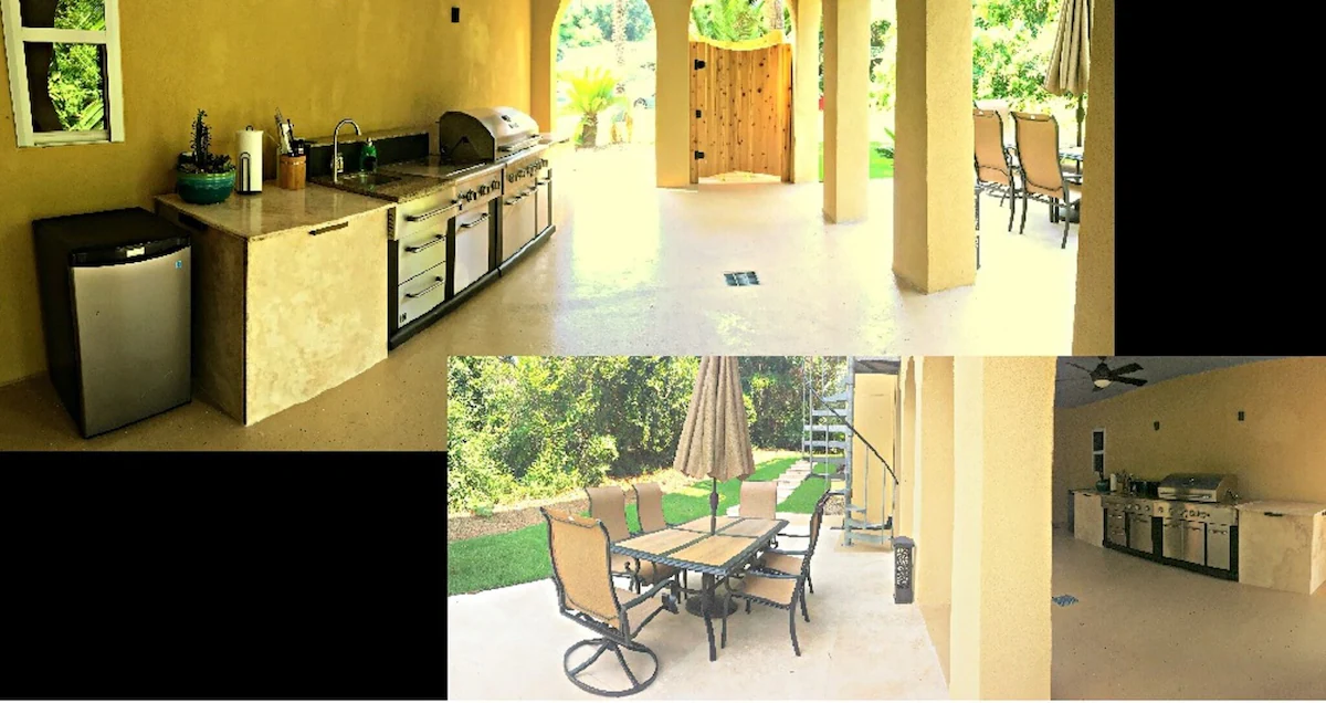 Underneath the home is a spectacular outdoor kitchen with a large prep area, a full gas range and sink as well as a large dinning table. There is an outdoor shower and a storage area for the sun chairs we provide. There is a 3-4 car enclosed garage as well as lots of space for at least 7 cars in the driveways in the front and back of the home.