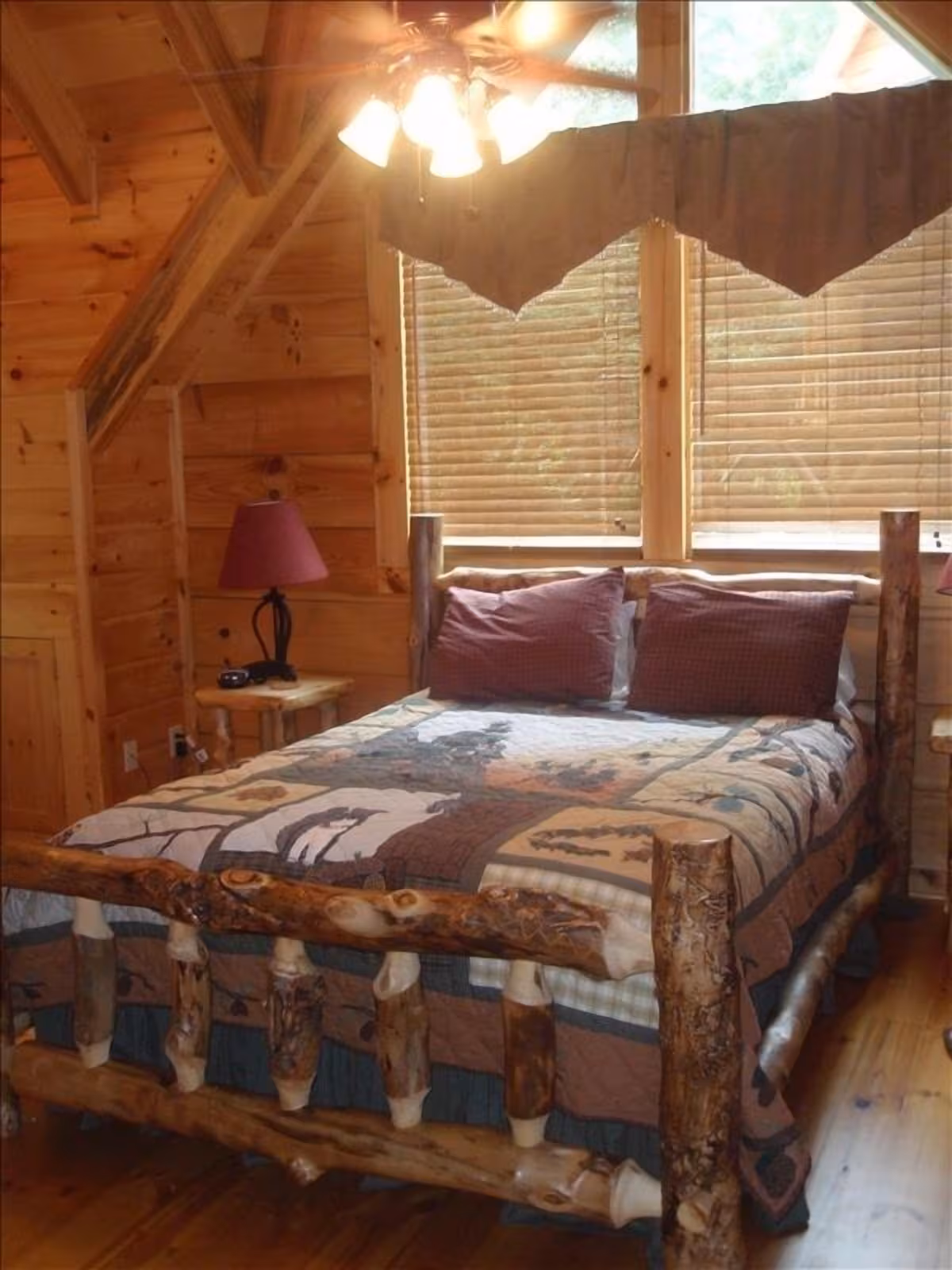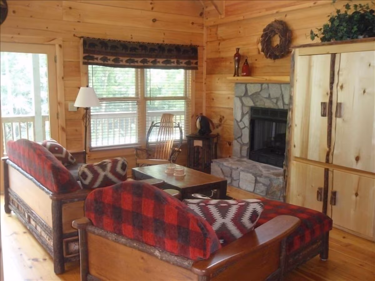 Log Cabin Features: Allow the peaceful sounds of two creeks, (one state stocked with trout) to help you relax and unwind. Sip your favorite beverage by the fireplace or on the wrap-around porch. Sleeps 8-10 Newly refurbished and furnished. Grand opening 9/5/2009. A wonderful, peaceful cabin that you too can call \'home\'.