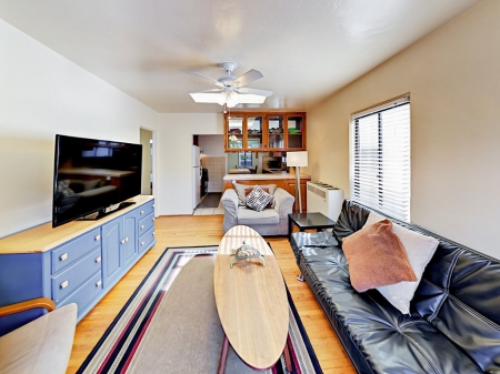 Simple style and plentiful sunlight welcome you into the living room, where hardwood floors gleam beneath a colorful area rug. A sleek black futon offers extra sleeping space, and two additional chairs seat your whole party for movies on the 45” TV with Netflix included. The unique “duck” stained glass window is a highlight of this space.
