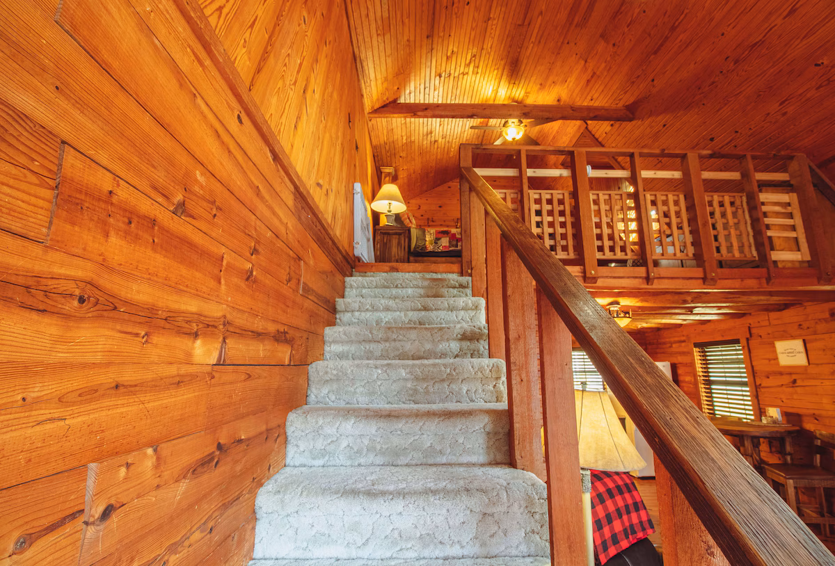 Head upstairs to the master bedroom loft which features a tall queen rustic bed with delightfully comfortable bedding. For those lacking in height and don\'t feel like hoisting yourself up, bed steps are provided for a quick boost.