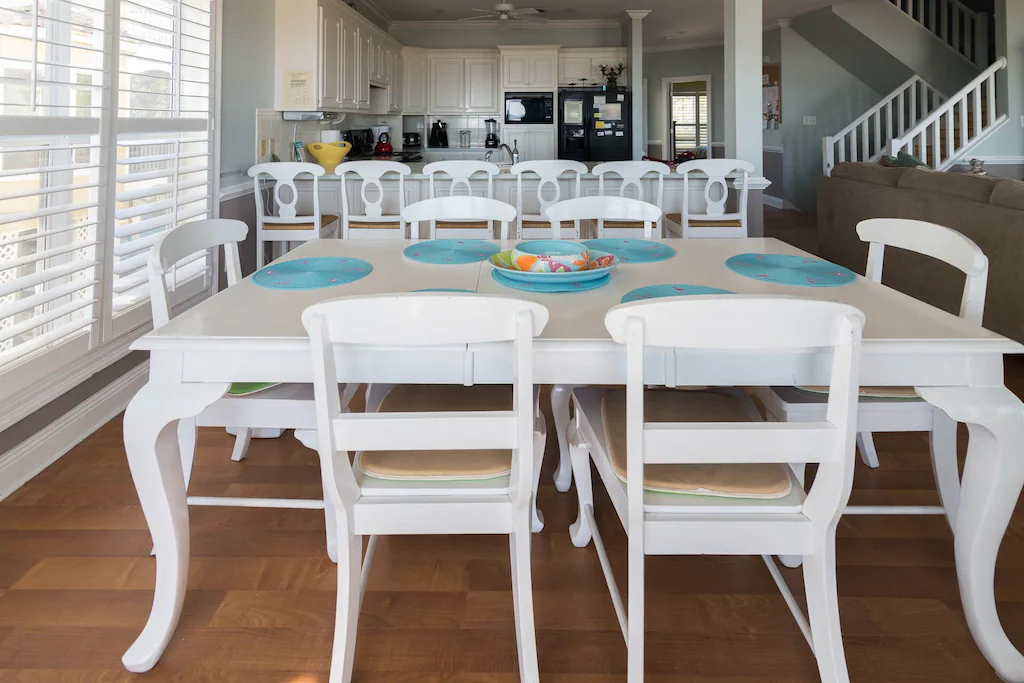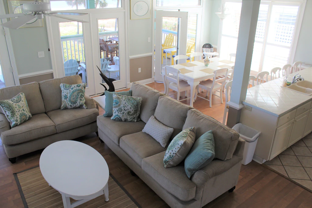 Two Palms Villa - Beachfront - Beautiful Villa- 4 BDR / 3.5 BATH pet friendly, Cape San Blas Vacation Rental , gulf front vacation home minutes from St. Joseph Peninsula State Park. We have finally completed the rebuild with some nice upgrades! It is now ready for you to enjoy. We have doubled the outdoor living space at this home. Why have a beach front home and not be able to be outside in comfort and enjoy it? We have 2 screened in porches with special railings that let you enjoy the views as well as comfortable sun loungers and lifeguard chairs. We have an open ocean front deck with 2 grills (one gas and one charcoal) with a nice dining table and barstools overlooking the ocean. To the side we have a separate deck with sun loungers to enjoy the sun and get a tan. In addition, we have included a built in 6 person hot spa, where you can watch the waves, sunset and stars! And if that is not enough we have a beautiful raised boardwalk down to the water with a viewing bench and outdoor shower at the end! It does not stop there, now for the little ones or big kids we have fun and games under the house. It has a shuffleboard court, horseshoe pit, ring toss games, enclosed private outdoor shower as well as a picnic table and chairs. We have 2 kayaks (a one seater and a 2 seater) as well as 2 stand up paddle boards with oars and life vests. These are for you to use complimentary but you must sign a liability waiver. On our website you will find many more photos, videos and Information about both our homes , TWO PALMS VILLA and our other house with Pool, Three Palms.)