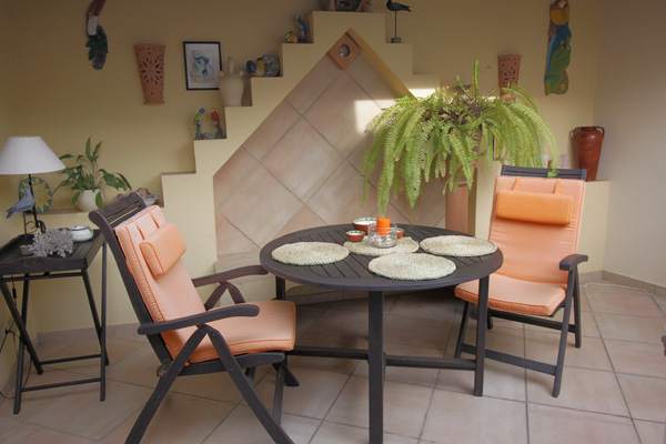 A beautiful, semi-covered, 25 m² courtyard with lots of plants & decorations, teak armchairs and loungers with cushions & a large teak table + charcoal grill .