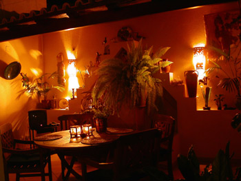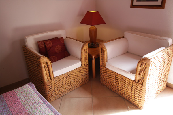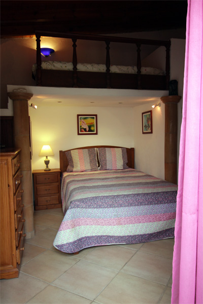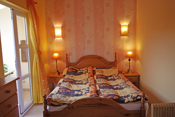 A bedroom with a double bed (2m x 1.50m), with a small table and 2 upholstered rattan armchairs, a walk-in closet, a chest of drawers, a powerful ceiling fan, digital satellite TV with over 30 German TV programs and over 30 German radio stations, a single bed in the gallery (for children only), direct access to the inner courtyard;