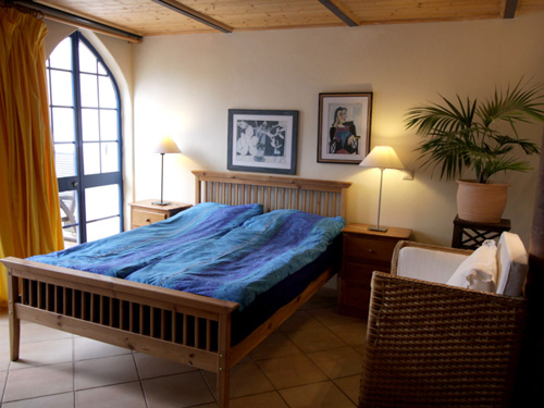A large living-bedroom with double bed 2 x 1.40m, bedside tables with matching bedside lamps, 1 table + 2 chairs and 1 upholstered rattan armchair, compact hi-fi with CD player, digital satellite TV with over 30 German TV programs + over 30 German radio stations, with a beautiful view of the tropical garden.