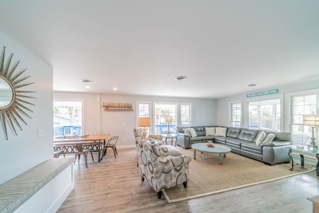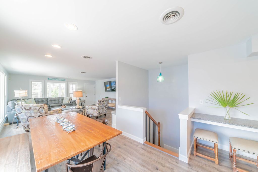 Lagerheads is a 4 bedroom 3 bath (plus outdoor shower with hot/cold water), 2 story home that sleeps 14. This home has recently been remodeled to include new flooring on the 2nd floor, new bathroom vanities, new appliances and updated kitchen and decor. The main entrance to the home is located on the first floor where there is a unique kids \"hang out\" area, equipped with colorful bean bag chairs, flat-screen TV, Blue Ray/DVD. Just down the hall is a kids room with 2 bunk beds. Both sets of bunk beds have a full sized bed as the bottom bunk, providing the perfect place for 6 kids to gather. The second bedroom offers a king sized bed. The first floor bedrooms share a newly renovated full bath with double sinks and shower.
