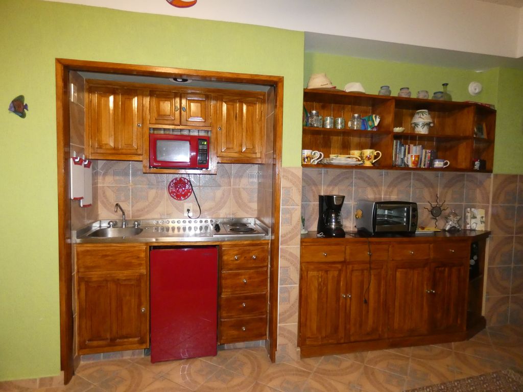 The kitchen area has an apartment size refrigerator, two burner stove, microwave, toaster oven, blender and coffee maker. We belong to the buildings laundry club.