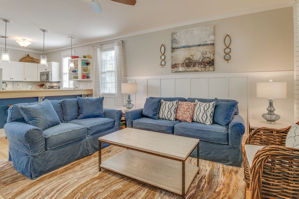 Step past the charming sitting area on the porch, through the green door, and into the bright and cheery main living area. The casual, beachy vibe beckons you to lounge on the soft blue couches while you check out what\'s on cable on the flatscreen TV.