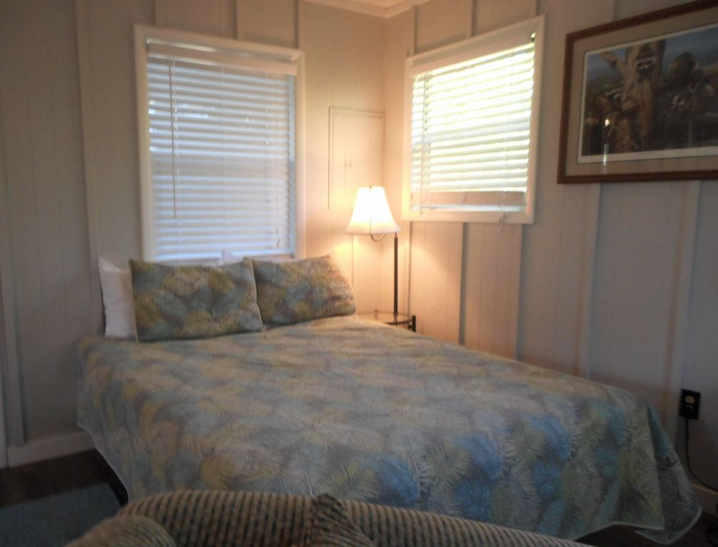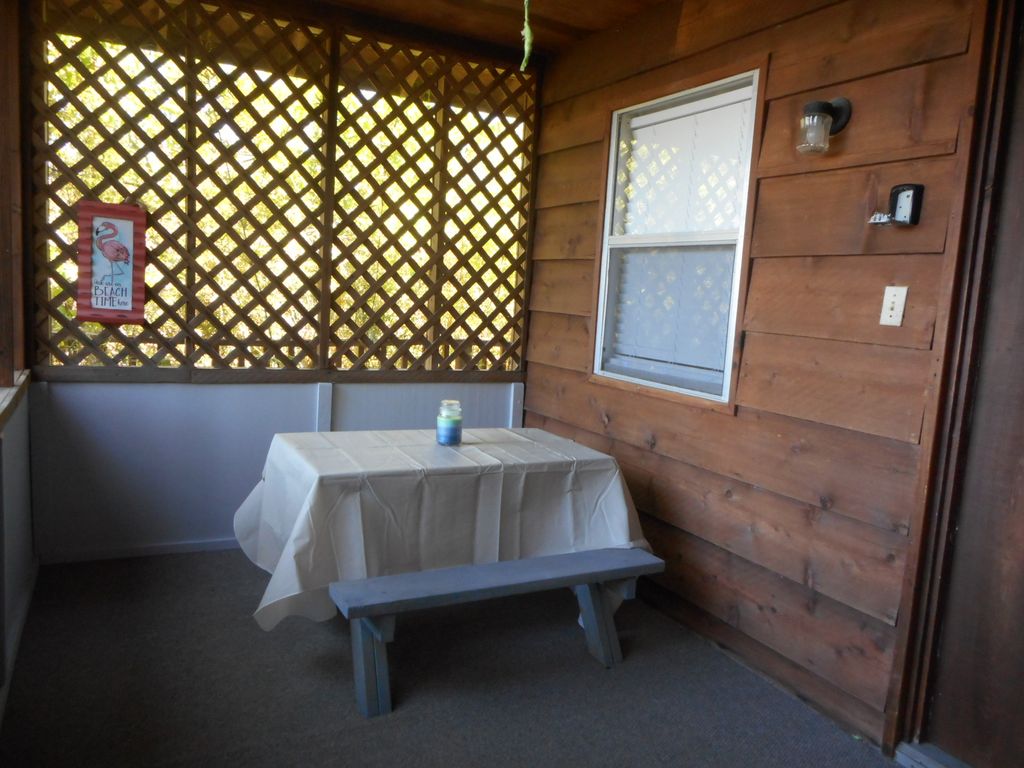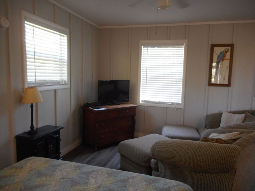 This cottage is located over about 9+ acres and has fantastic views looking out over St. Joe Bay and the Old Saltworks Pond. Dug during the Civil War to produce salt! Enjoy the beautiful sunrises and gulf breezes on your screened porch or the open deck. The cabin is a suite, large room with full kitchen, seating and eating area and sleeping area. NEW Kitchen has stove top, fridge, microwave, toaster, coffee maker, toaster oven, and outside charcoal grill. Has table with 4 chairs. Seating area has two over sized stuffed chairs and ottomans to relax and read or watch the nice TV, DVD and WIFI. Has comfortable queen size bed. A bath with shower. Downstairs is covered parking and also a hot and cold outside shower. Just a short walk down to the boardwalk and all the Bay activities or just relax by the bay. (Great place for scallop season, too)