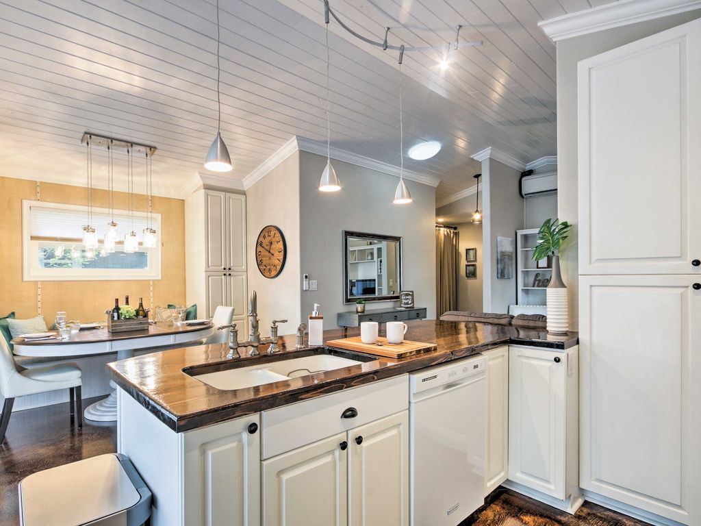 Start your day by enjoying a morning cup of coffee at the 3-person breakfast bar in the kitchen and plan out which beach you want to visit. Before you hit the road, prepare yourself a hearty breakfast in the fully equipped kitchen is outfitted with a 4-burner electric stovetop, oven, microwave, polished-wooden countertops, and beautiful white cabinetry.