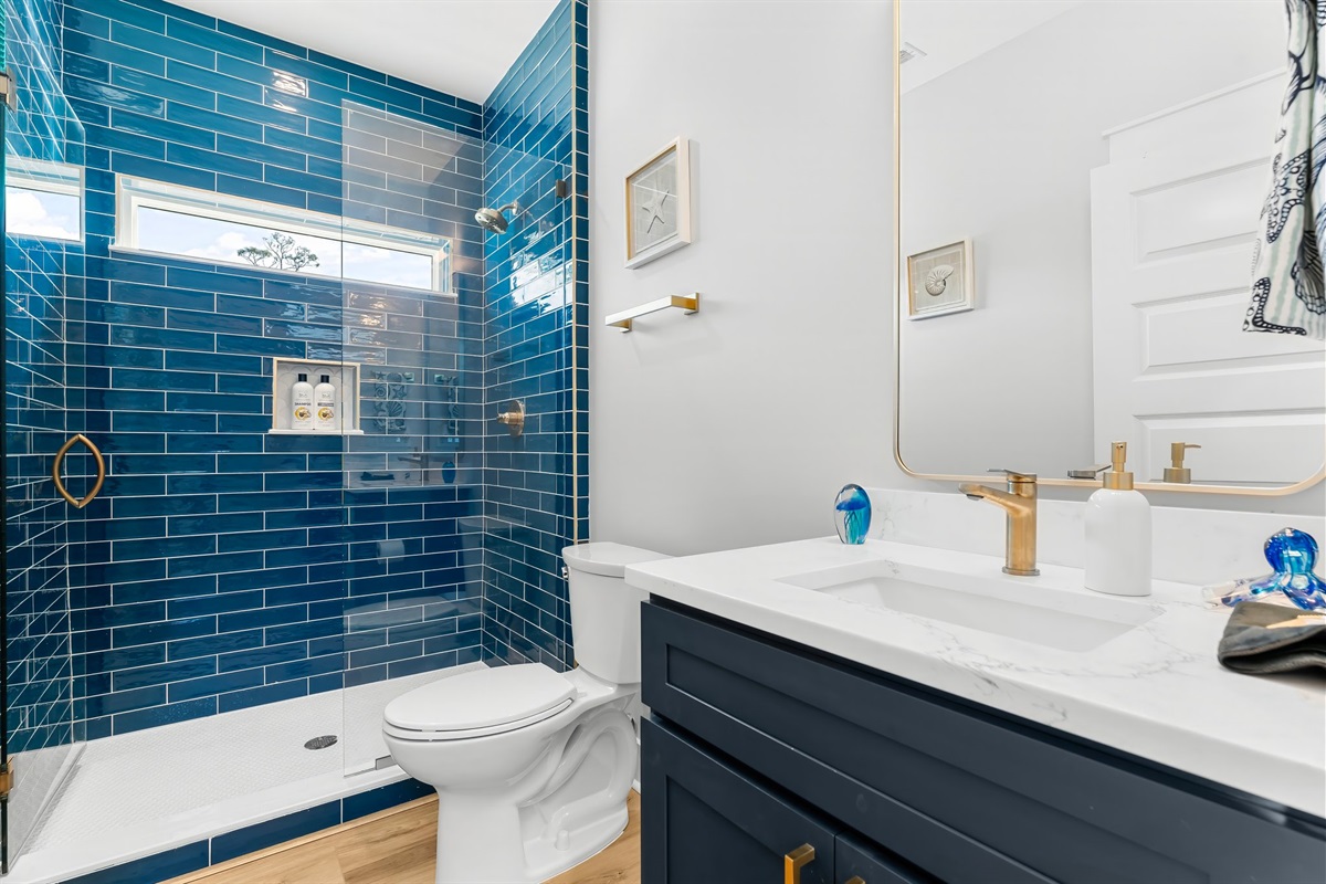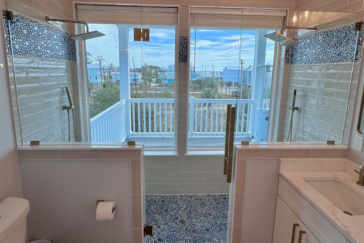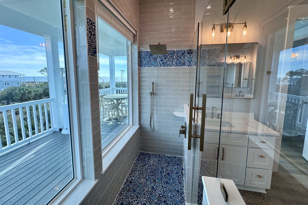 The master suite is a haven of luxury with an oversized shower featuring a full glass wall, offering unobstructed views as you unwind.