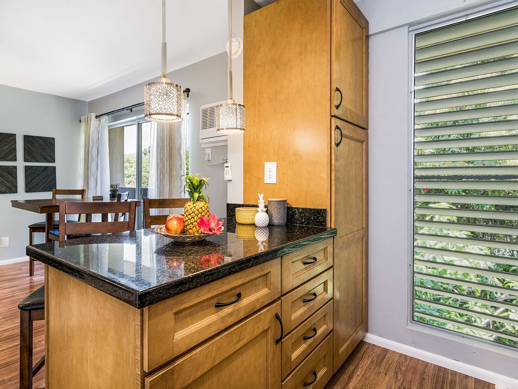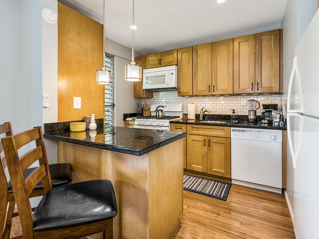 Top floor end unit with Hualalai mountain views! Quality extensive renovations provide a fresh, clean look! The window A/C does a great job chilling the condo. This unit is conveniently close to the heated pool and BBQ area. With fully sized kitchen and washer / dryer routine chores are a breeze allowing you more time to enjoy all this spectacular Island has to offer.