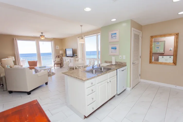 This is a full 3 bedroom, 3 bathroom condo Beach Front--West corner unit on the 6th floor! Unobstructed view to Destin. It\'s a new property, very well-insulated and quiet.
