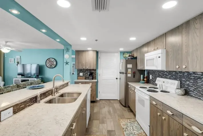 Tower 4-1103 has new upgraded flooring throughout, no carpet! Brand new ash cabinets and quartz countertops. Brand new furniture in every room including the balcony. There is a reclining love seat and 2 individual recliners so you can relax when you come up from the beach.This roomy 1370 sq ft condo has the best floor plan on the beach. All rooms have floor to ceiling views of the gulf. Living room has a 42\" TV, a new queen sleeper sofa and a double reclining loveseat. The dining room table seats 6 + the breakfast bar seats 4. The owners have taken out a kitchen wall, opening up the kitchen to the dining room and living room. The master bedroom has a brand new King bed and a door to the balcony and large walk-in closet. The master bath has double vanity with brand new ash cabinets and quartz countertops. The master bath shower has been remodeled to provide a handicap walk-in shower. The large guest suite has 2 new queen beds and the guest bath has a double vanity with new cabinets and countertop, a garden tub with shower and a walk in closet. Like the master suite it has a door to the balcony. Both bedrooms have a TV & dvd player. Both the bedrooms feature brand new bedroom furniture. A stunning kitchen, free wifi, large washer & dryer and large balcony make this condo a great place for your vacation getaway!