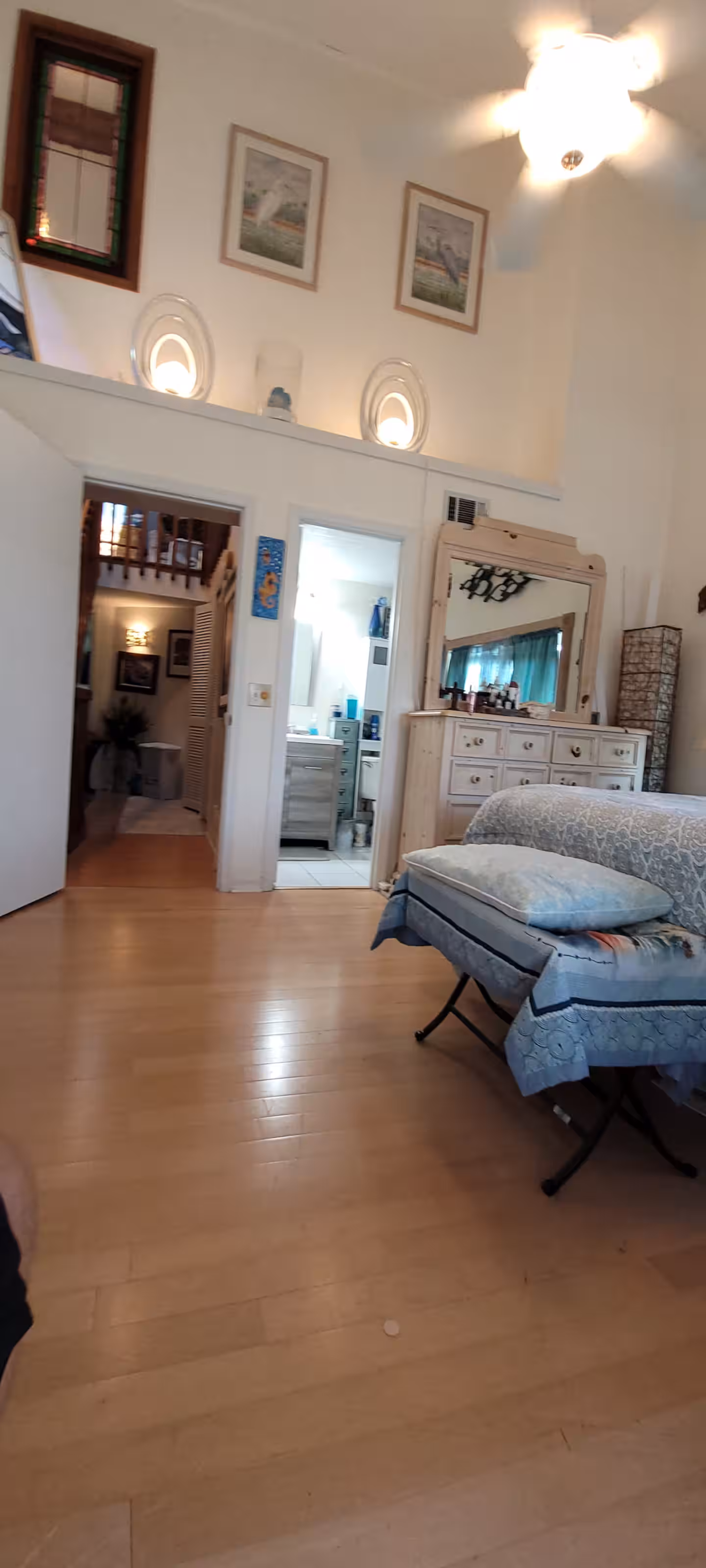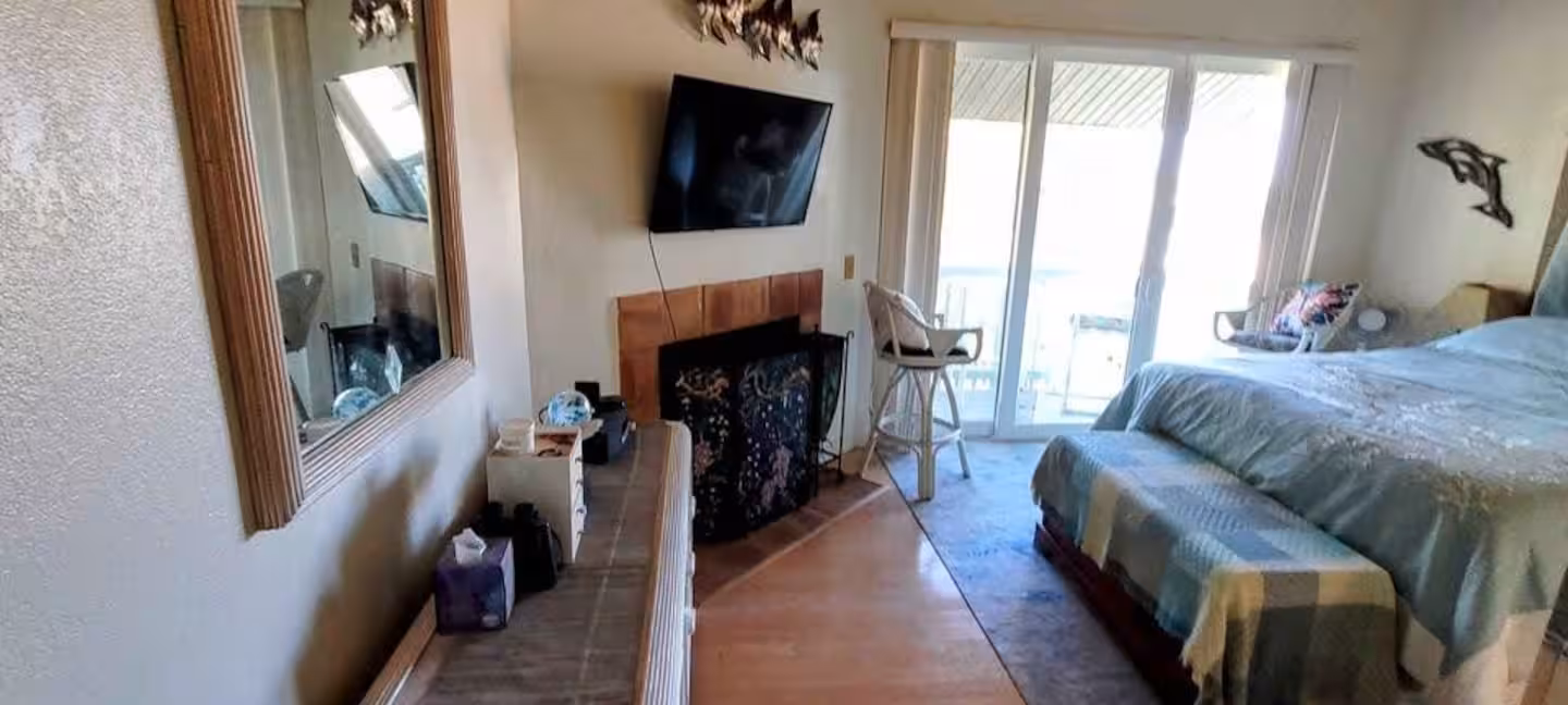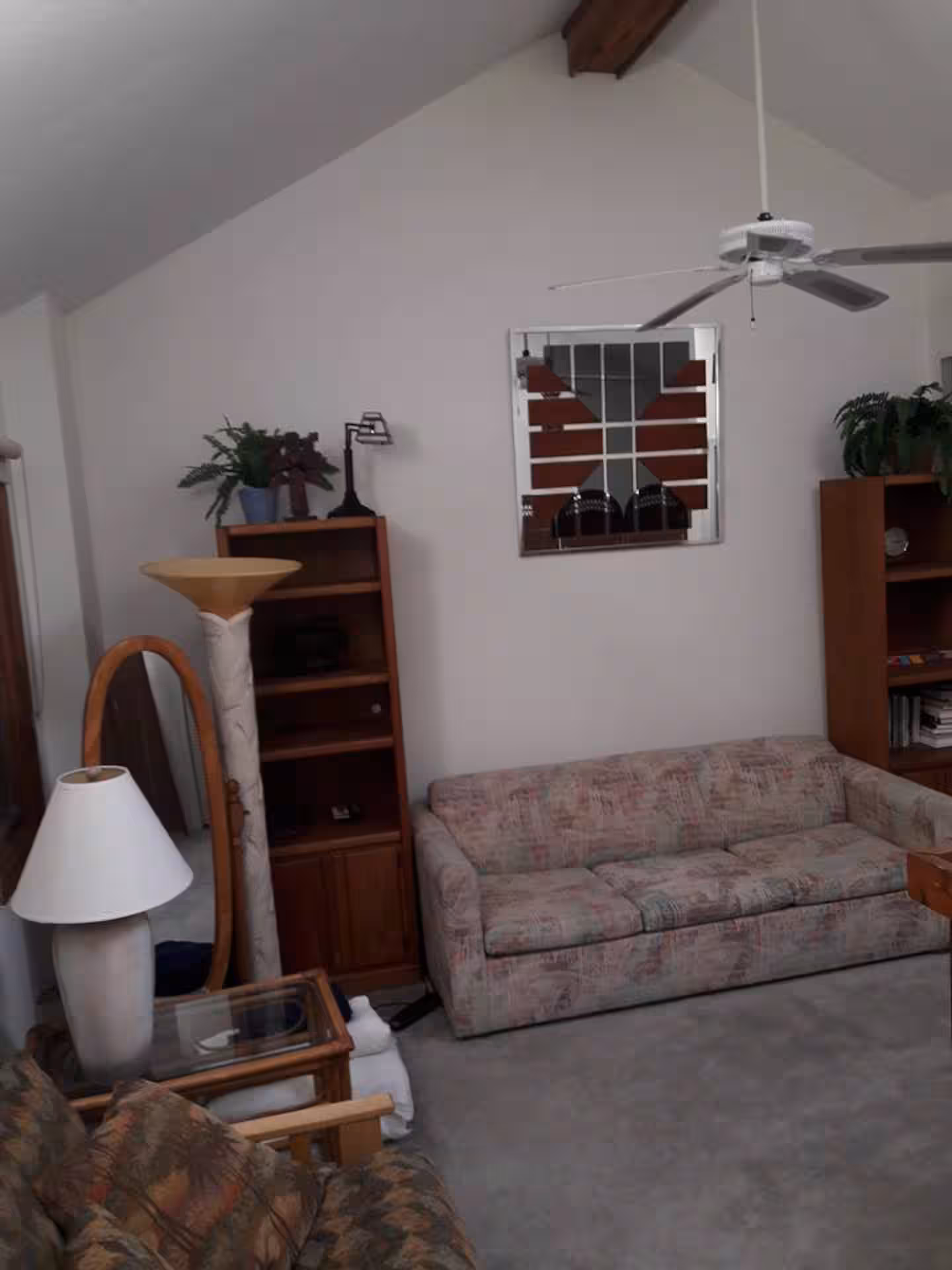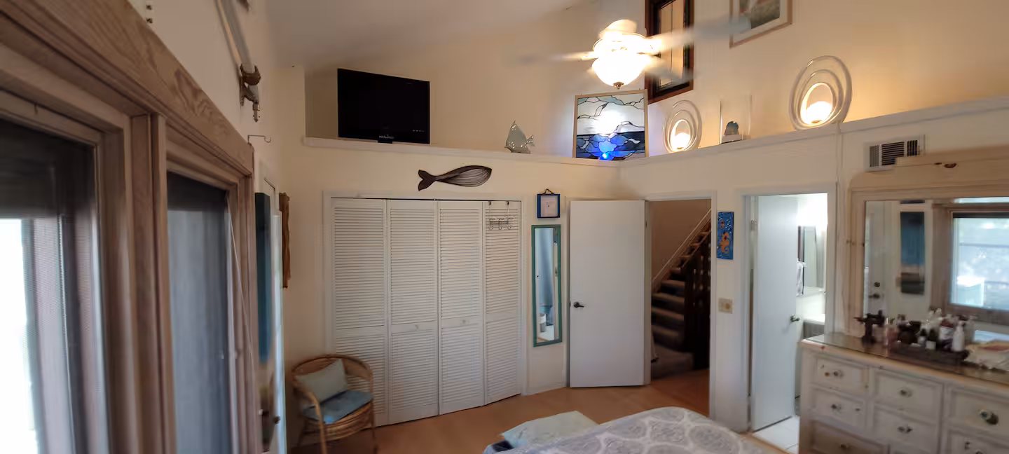 Vaulted 30 foot ceilings, full size bed, full bath, two large windows, full glass door balcony inside screen room overlooking pool. Stained glass window and art.