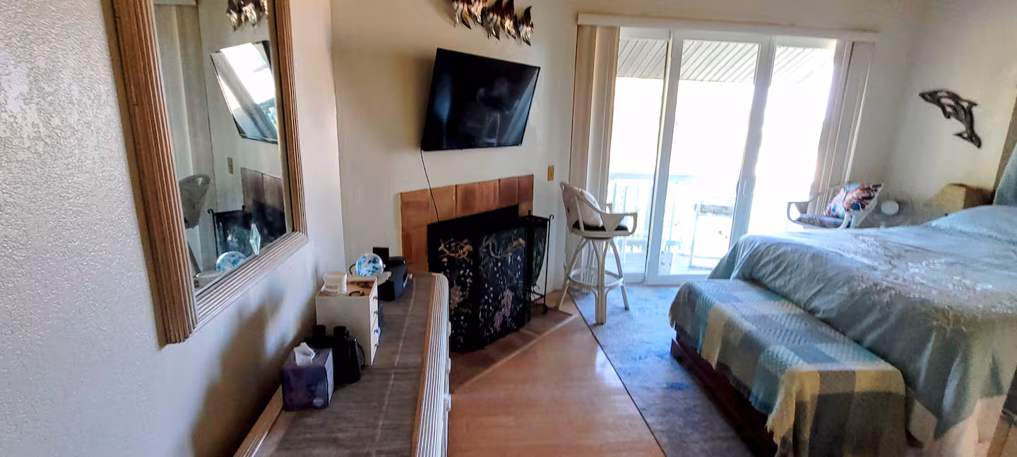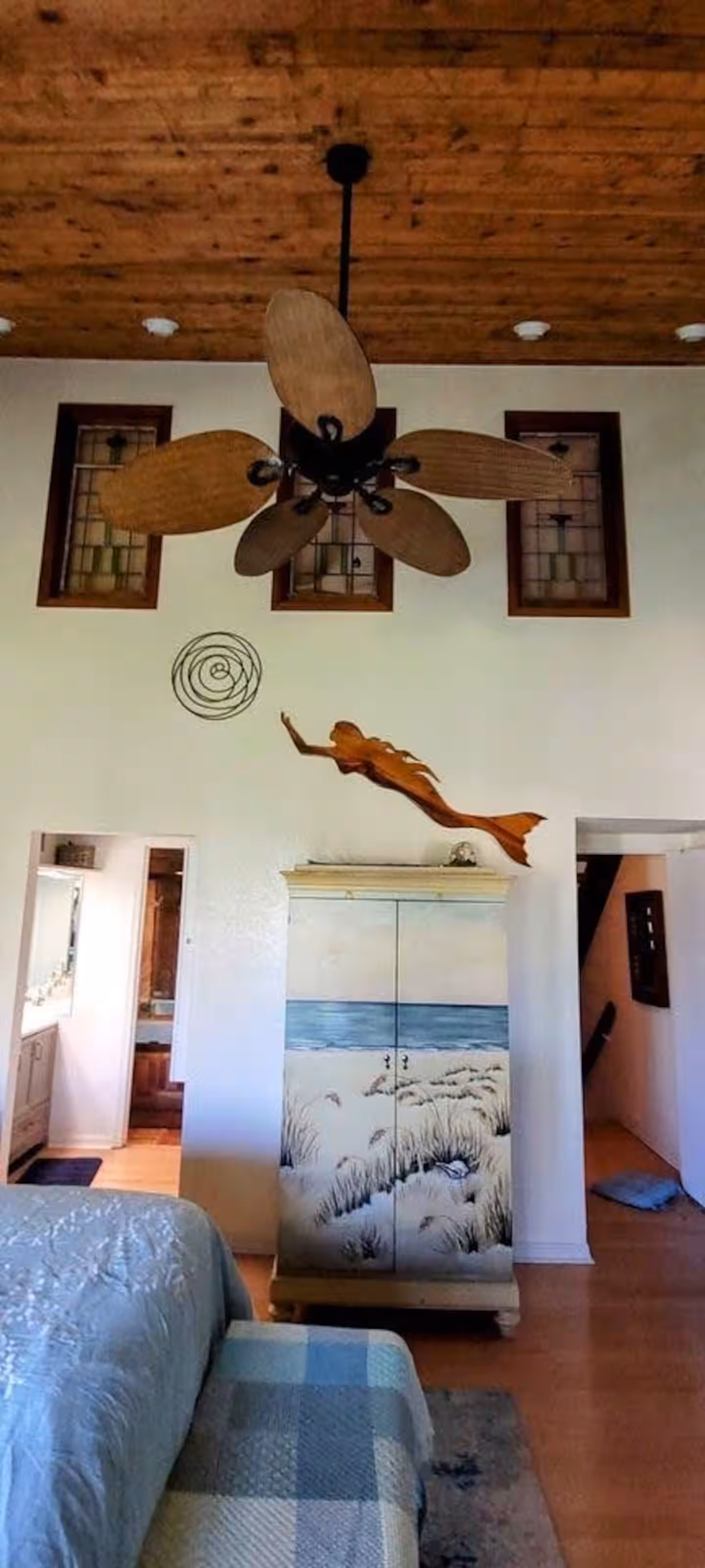 30 foot vaulted cedar ceiling, stained glass windows, 12X8\' sliding glass doors to deck with ocean views. Ocean views also from multiple ares in the bedroom, including the bed, and chairs. Fireplace and Jetted whirlpool hot tub/shower help to create a peaceful ambience for deep relaxation. Separate double vanity across from walk in closet.
