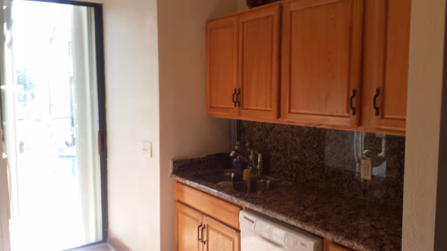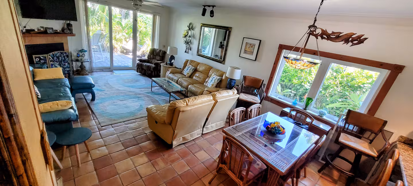 Limited Ocean views from the first floor living room and patio with Mexican Saltillo Tile floor and 3/4 bathroom, with agate crystal vessel sink. Open floor plan in the living space including kitchen (with new (2020) oak cabinets and granite counters), indoor 5-person breakfast bar, dinning room, bar height bistro for four, living room with fire place, limited ocean view through 12 foot wide sliding glass doors to a paver patio with unique outdoor bar, 4 bar height chairs and rocking chairs.