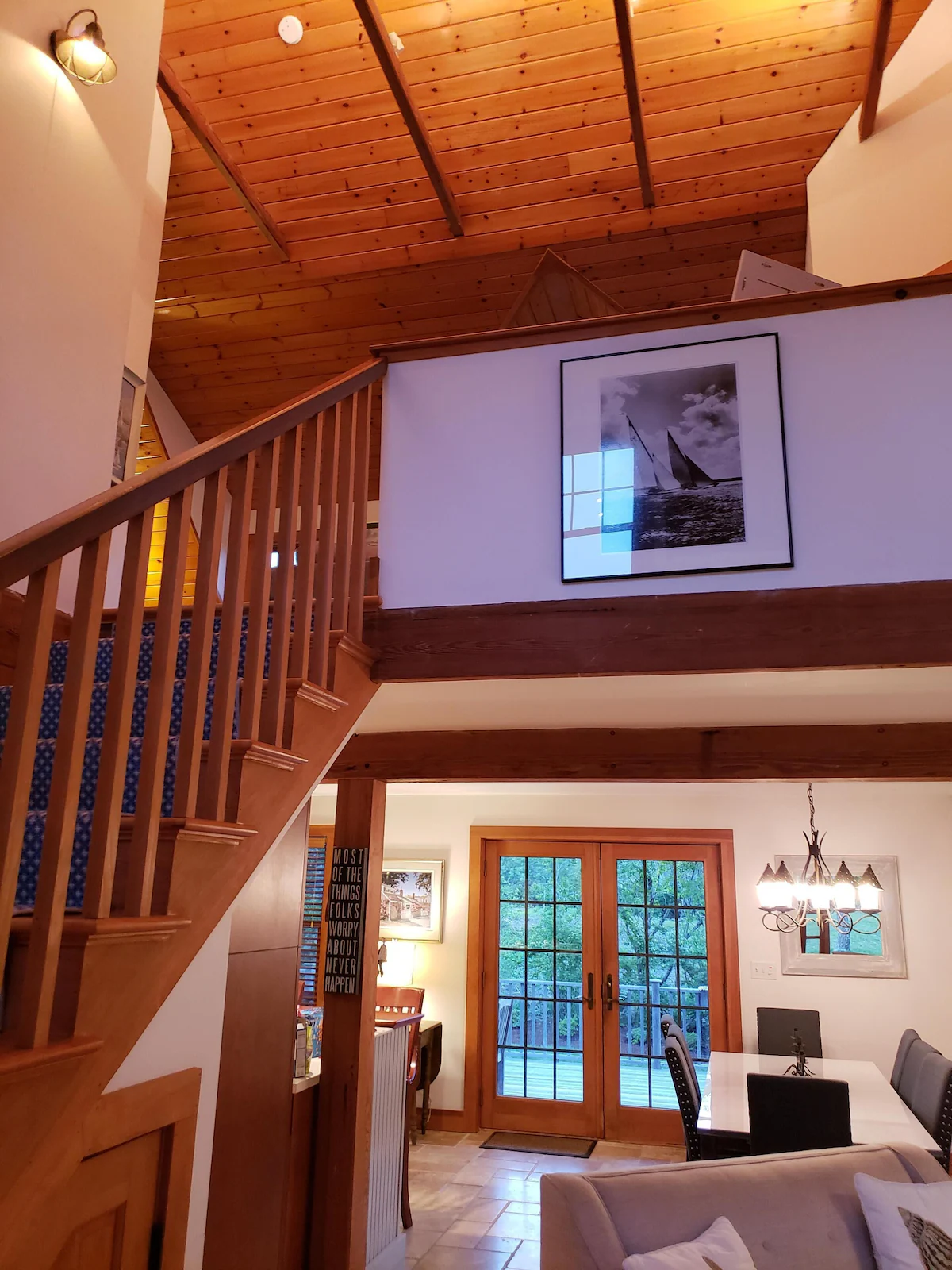 The second floor has a sitting/family room area, with TV, books to read and a French door that opens to a balcony with chairs to enjoy the scenic views.