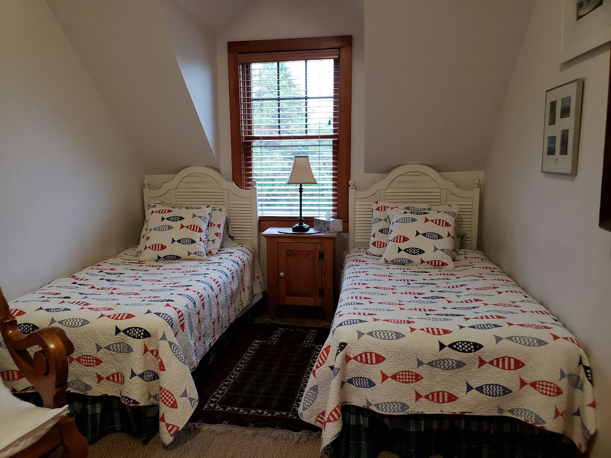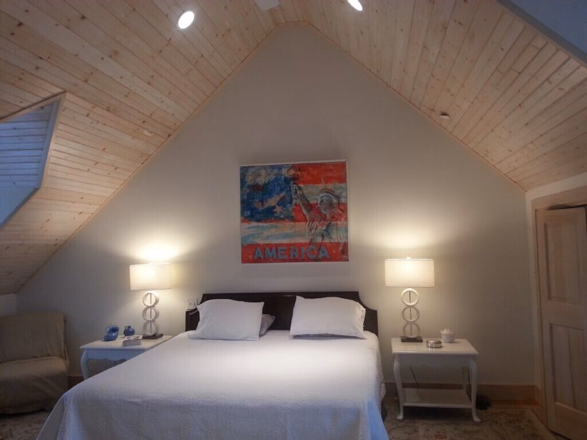 The master suite on this floor has a white-washed wooden vaulted ceiling. This spacious room has a king bed, full bath and large TV, desk, and day bed. There are two additional bedrooms with twin beds and another full bathroom on this floor.