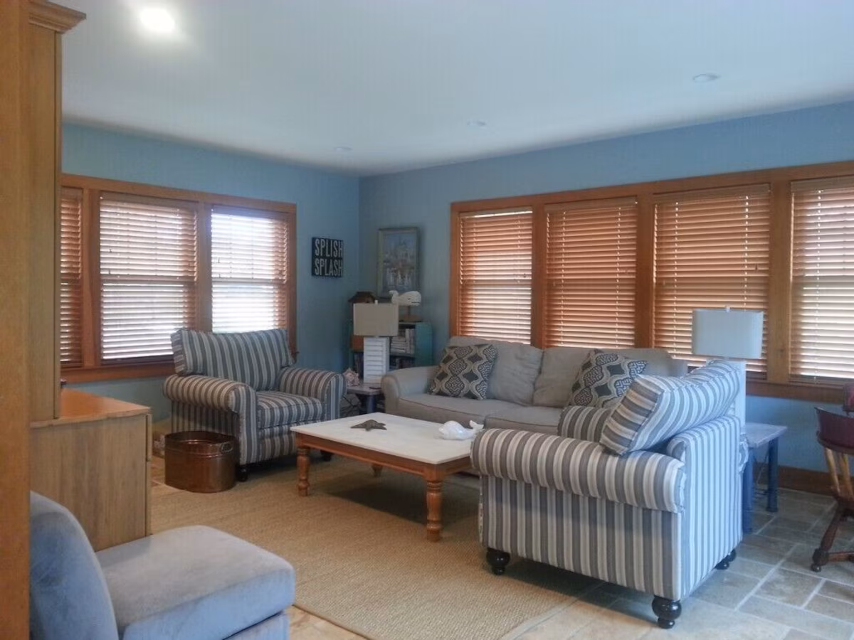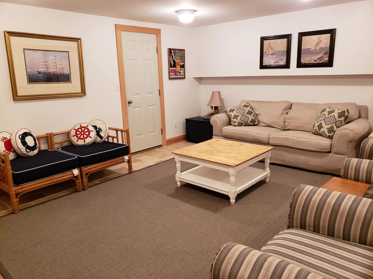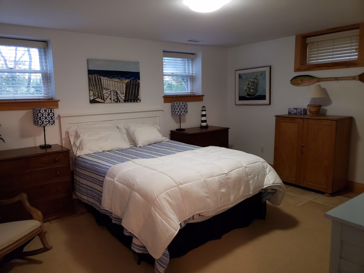 The finished lower level has a bedroom with queen bed and full bath, adjacent game room with slap air hockey and board games. This area is great for children or for an au pair. There is a shed with 5 adult bikes, child\'s bike, fishing rods, beach chairs, beach mats, a beach caddy and three coolers. A generous supply of beach towels are stored in the kitchen cabinet.
