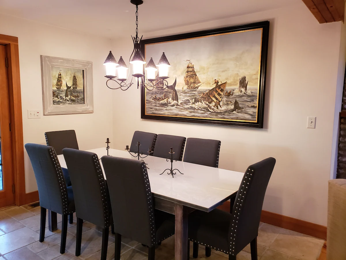 The floors throughout the home are wide pine and stone. There is a first floor bedroom suite with queen bed and full bath. An additional covered front porch in the front of the house has furniture for relaxing and enjoying that morning cup of coffee.