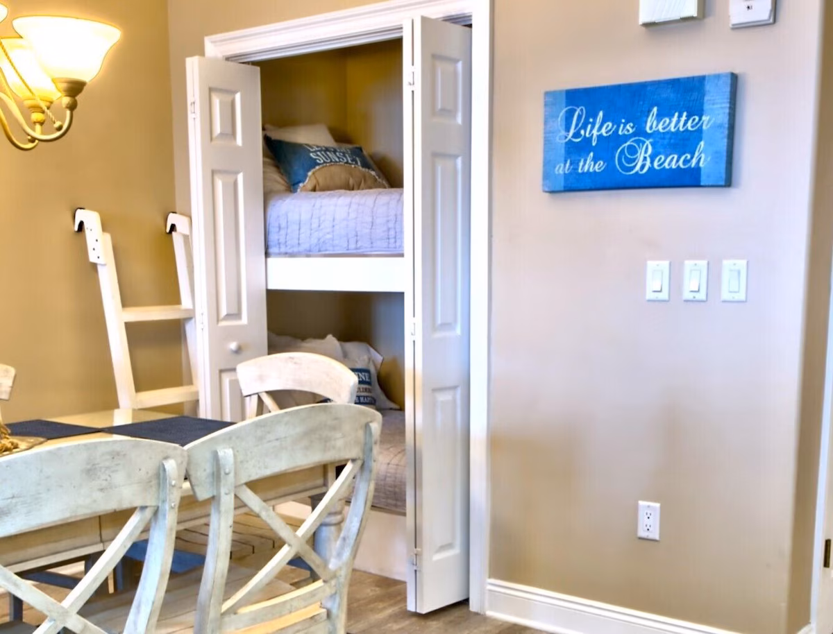 • Bunks (2 twin beds) with 10 inch comfort mattresses, recessed into the wall and comfortably sleep an adult.