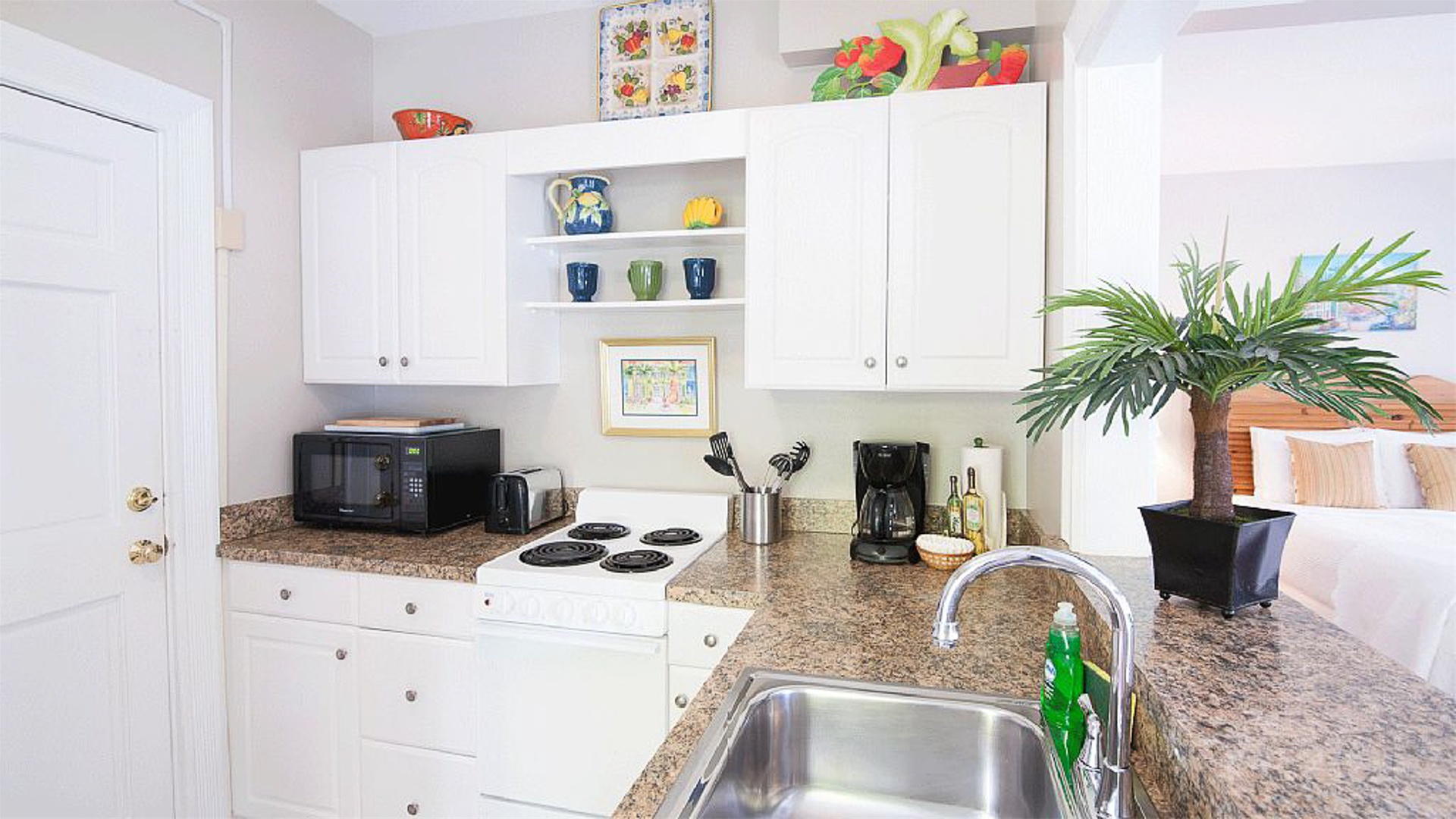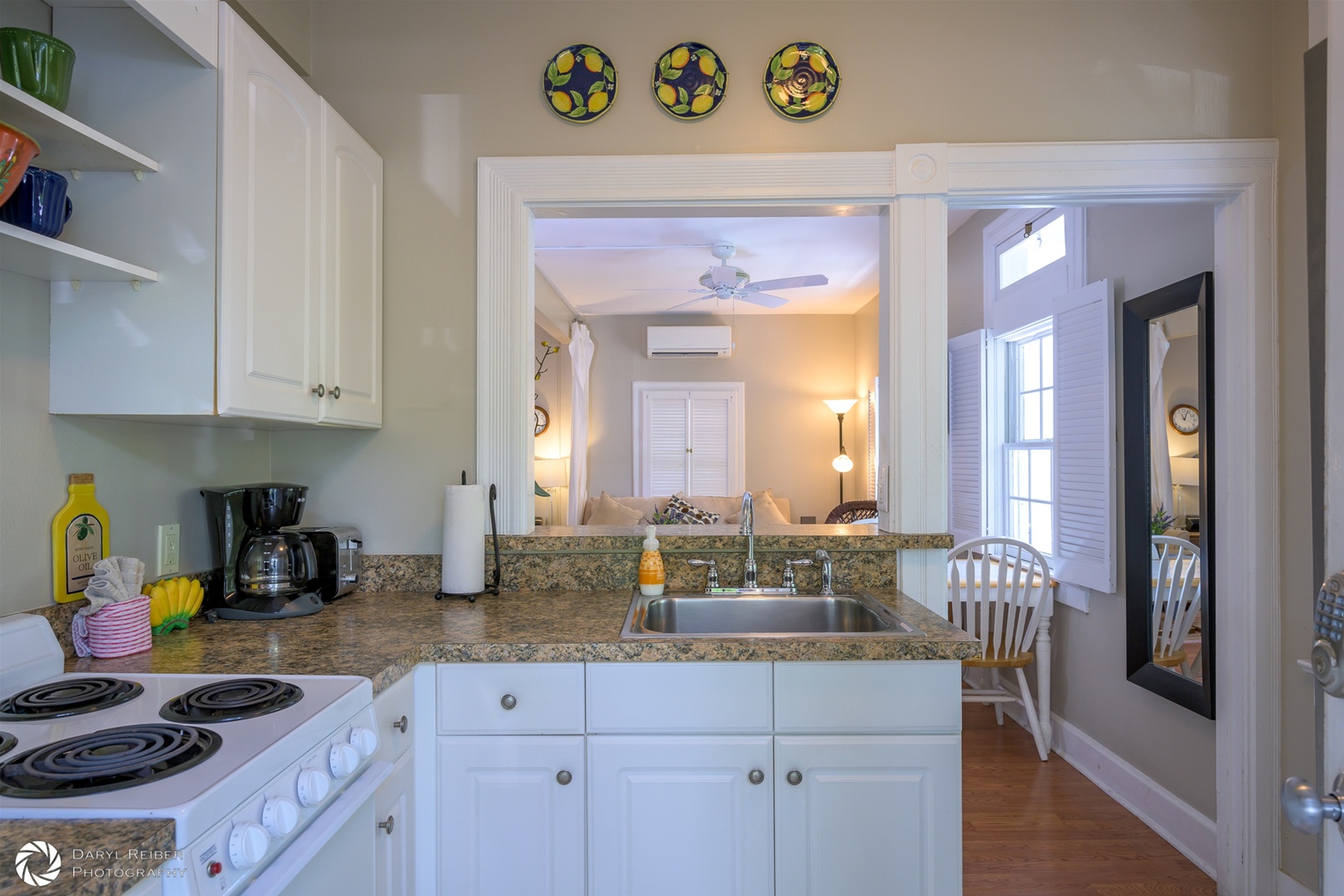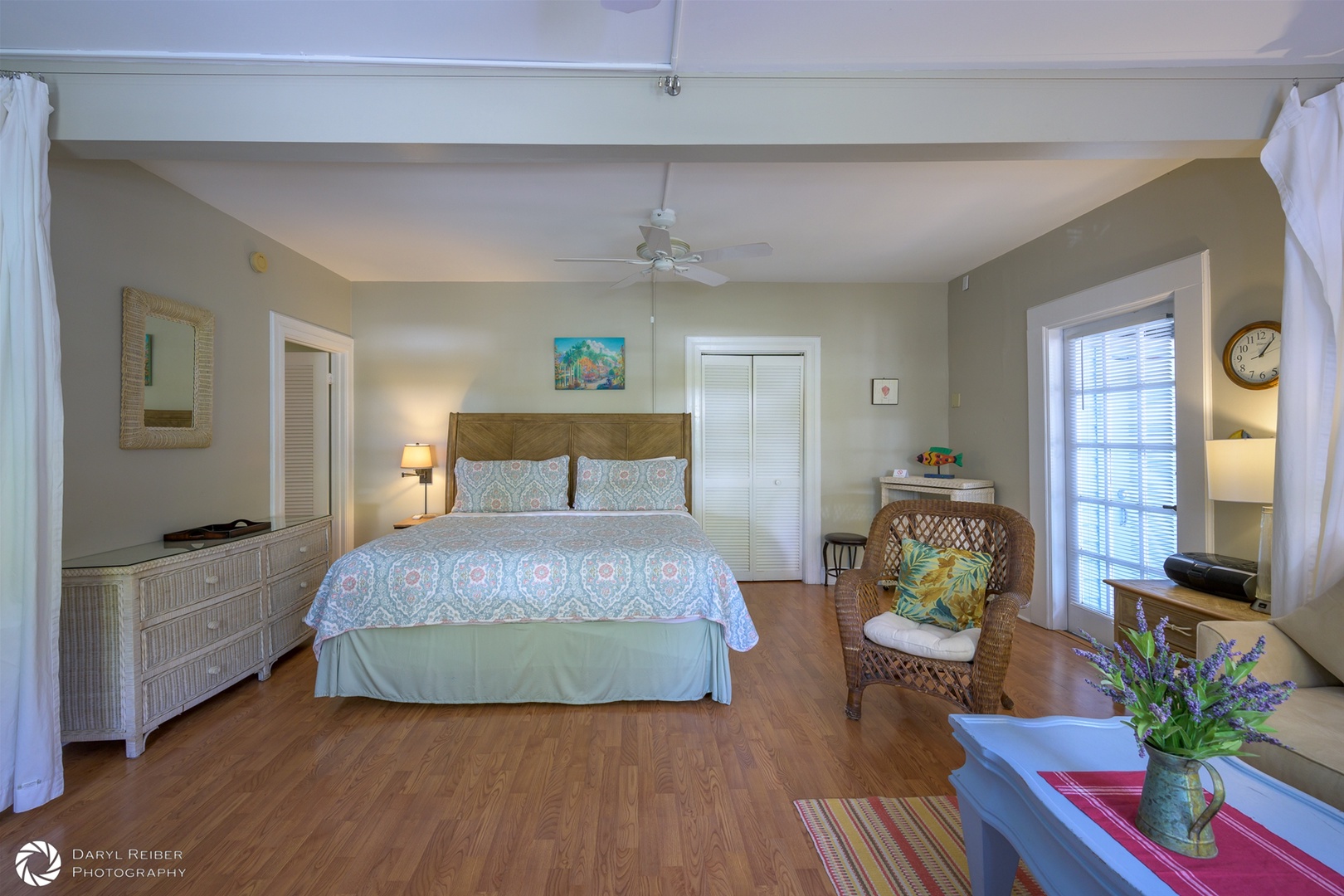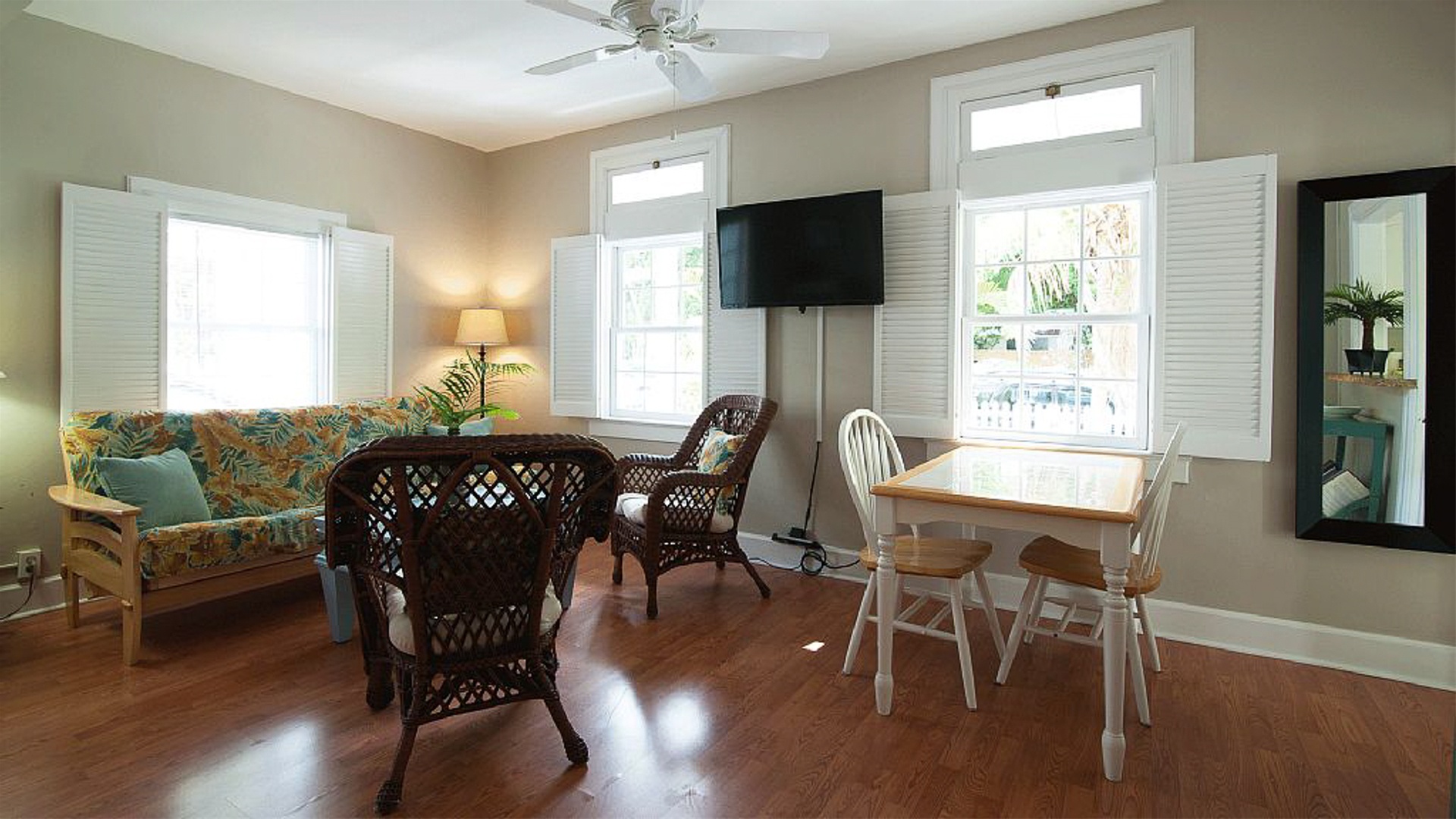 This charming suite is comfortably furnished with a king bed, comfortable couch, dining table, flat-screen TV, and tropical artwork. Transom windows and an open floor plan create a breezy atmosphere in Harvey’s Haven. The full kitchen features a coffee maker, oven, stove, refrigerator, and the accessories to make any chef happy. A spacious bathroom with standing shower and full-length mirror completes this wonderful accommodation.