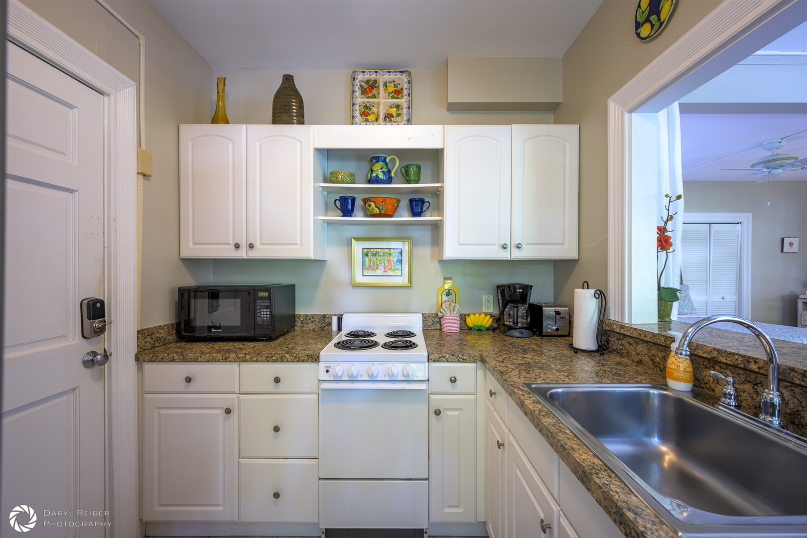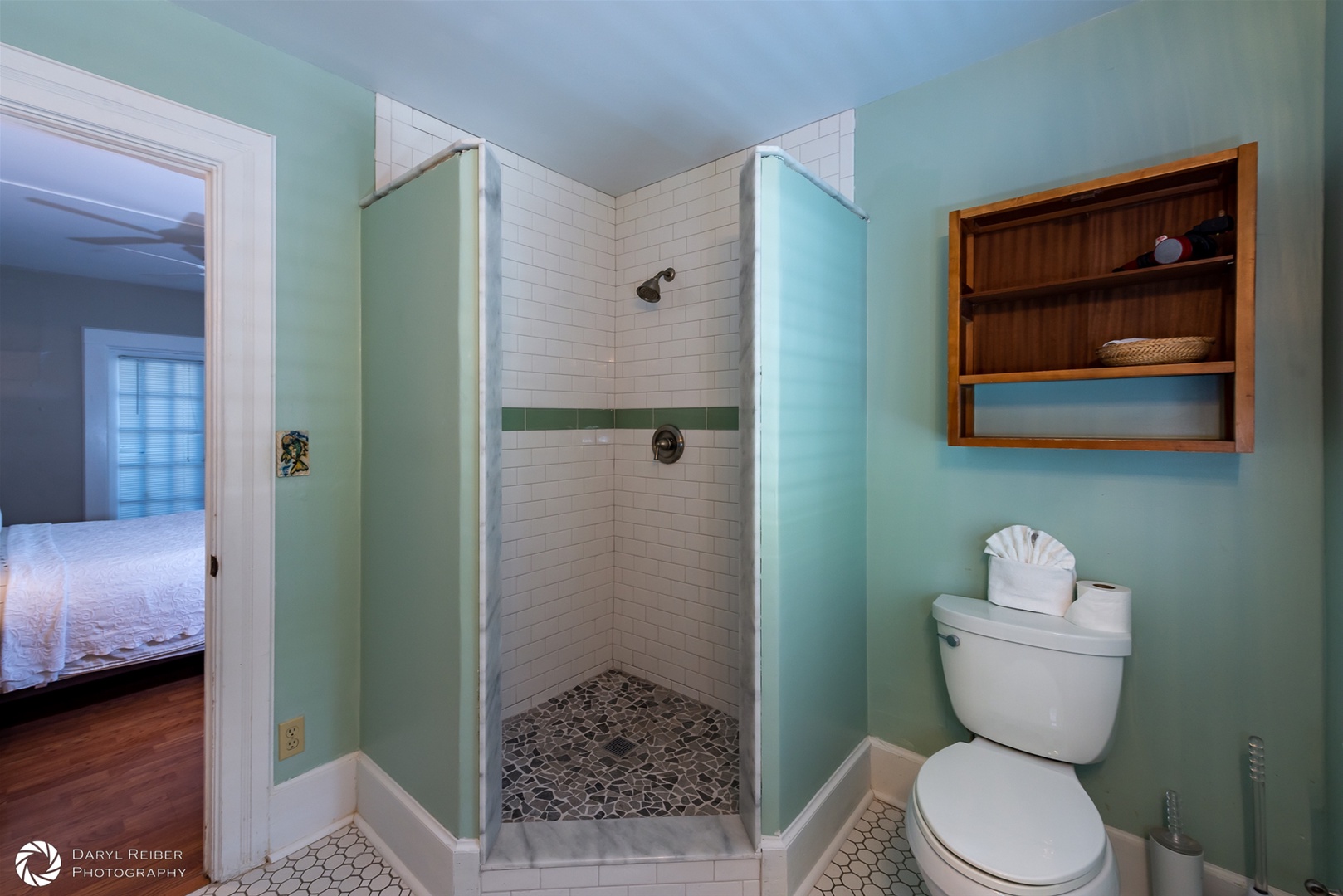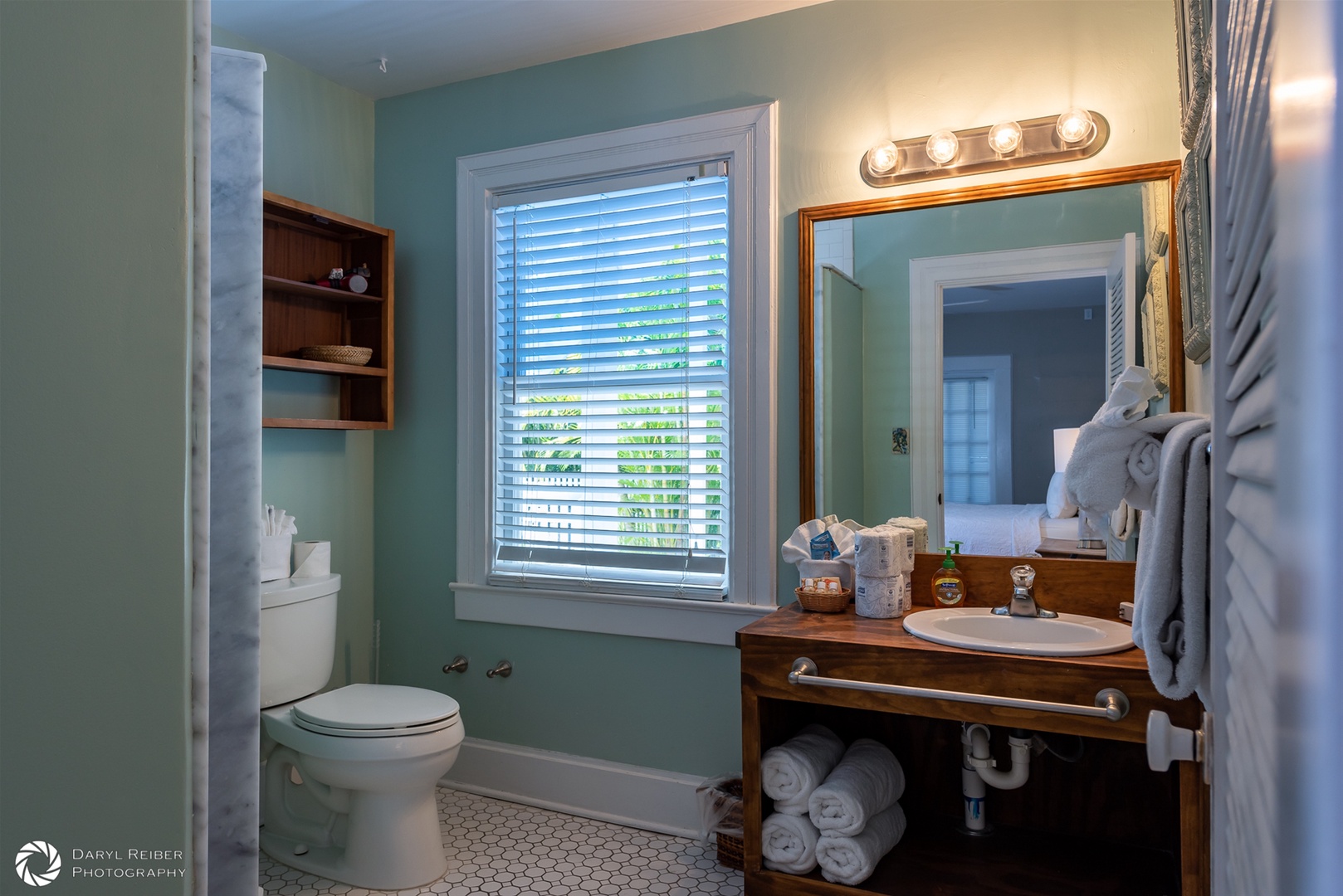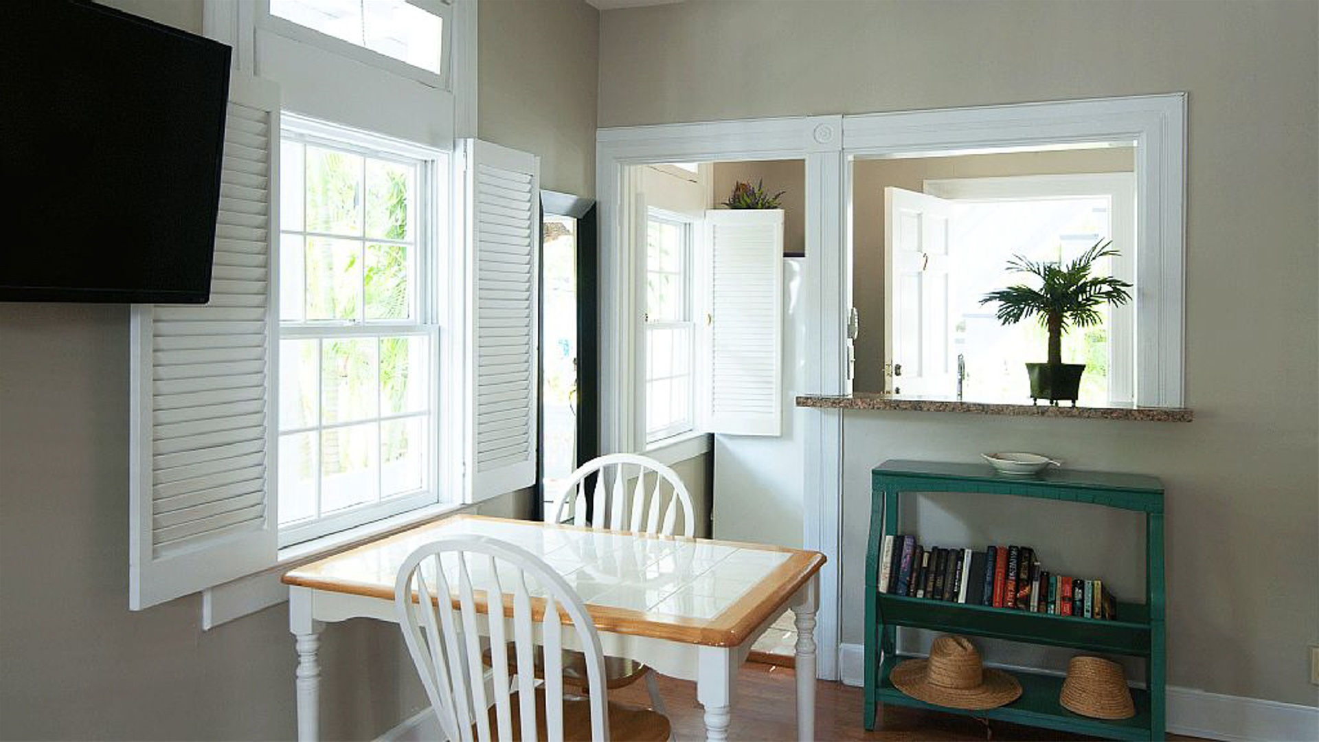 This charming suite is comfortably furnished with a king bed, comfortable couch, dining table, flat-screen TV, and tropical artwork. Transom windows and an open floor plan create a breezy atmosphere in Harvey’s Haven. The full kitchen features a coffee maker, oven, stove, refrigerator, and the accessories to make any chef happy. A spacious bathroom with standing shower and full-length mirror completes this wonderful accommodation.
