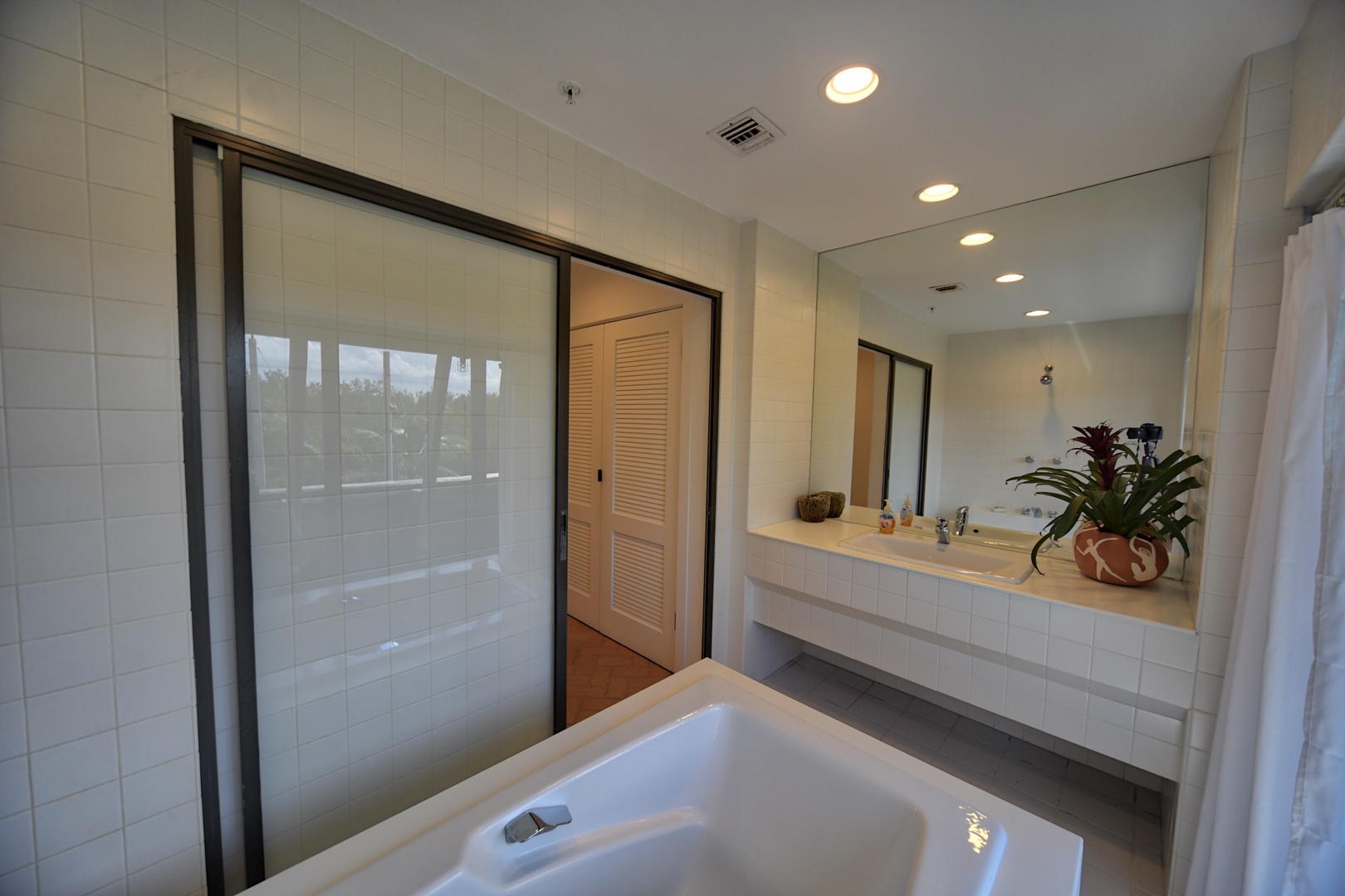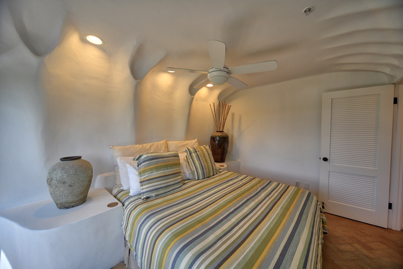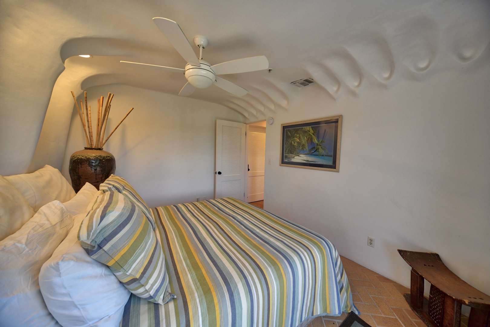 The large patio doors can be left open to allow the ocean breeze in to the spacious, comfortably furnished living area, which features a flat panel television and a sizeable dining area with a wet bar. Down a short hallway is the fully equipped kitchen with a glass-top range. The large, unique bathroom includes conveniently separated areas for the sink and commode, as well as a massive tub for soaking. The tranquil bedroom contains a king sized bed and heavy drapes for those mornings you want to sleep in. The entire condo features distinctive, Adobe-style rounded walls with built-in furniture and charming brick tile floors. The whitewash walls reflect the lovely natural light and create an effect that is fresh and soothing to the senses.