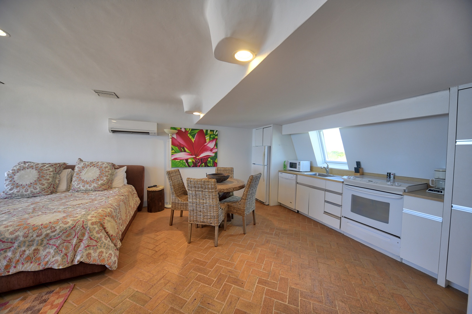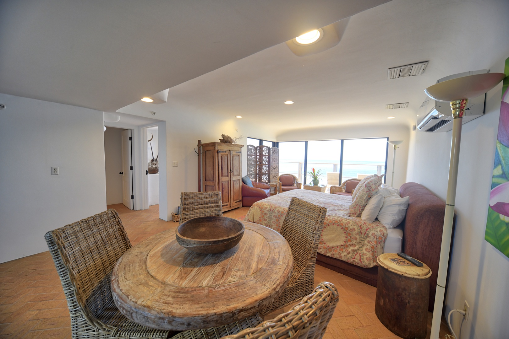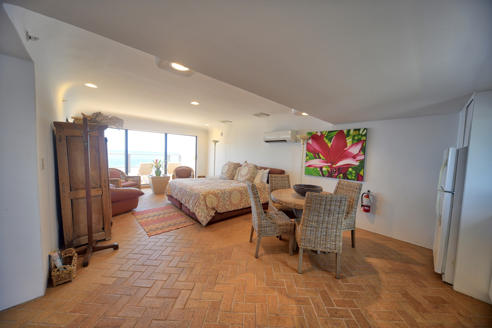 The large patio doors can be left open to allow the ocean breeze in to the spacious studio living area, which features a king sized bed, comfortable chairs for lounging, a flat screen television and a large dining table. The fully equipped kitchen features a glass-top range. Down a short hallway is the large, unique bathroom featuring a glass enclosed shower and lots of closet space. The entire home features distinctive, Adobe-style rounded walls and charming brick tile floors. The whitewash walls reflect the lovely natural light and create an effect that is fresh and soothing to the senses.