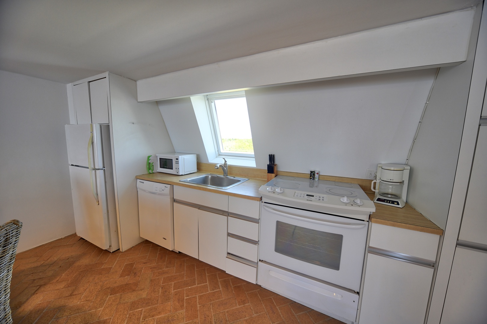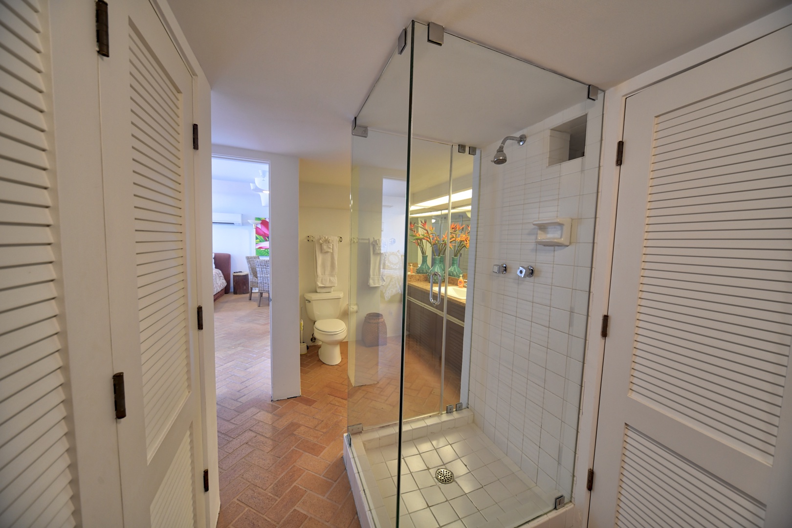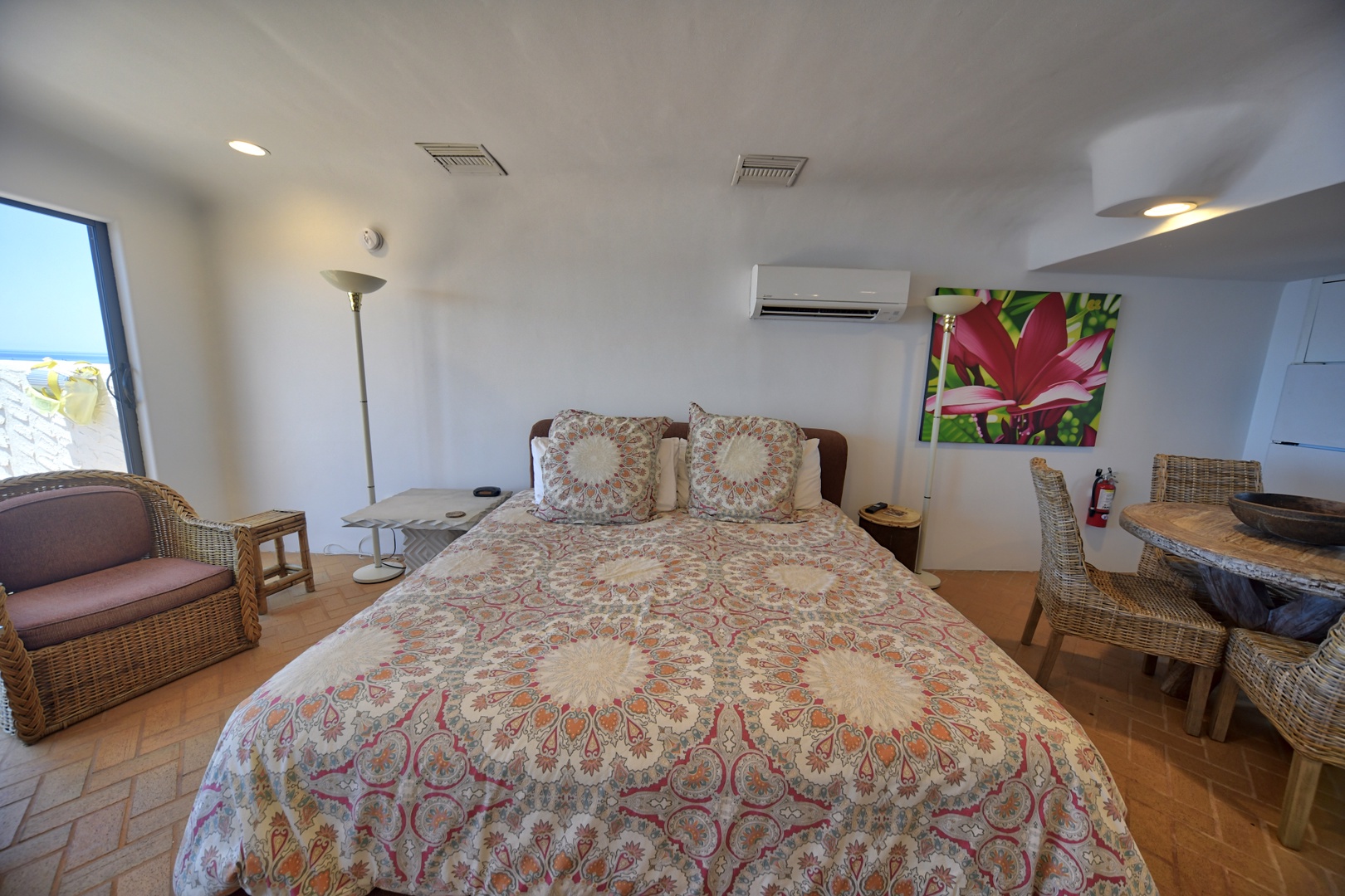 The large patio doors can be left open to allow the ocean breeze in to the spacious studio living area, which features a king sized bed, comfortable chairs for lounging, a flat screen television and a large dining table. The fully equipped kitchen features a glass-top range. Down a short hallway is the large, unique bathroom featuring a glass enclosed shower and lots of closet space. The entire home features distinctive, Adobe-style rounded walls and charming brick tile floors. The whitewash walls reflect the lovely natural light and create an effect that is fresh and soothing to the senses.